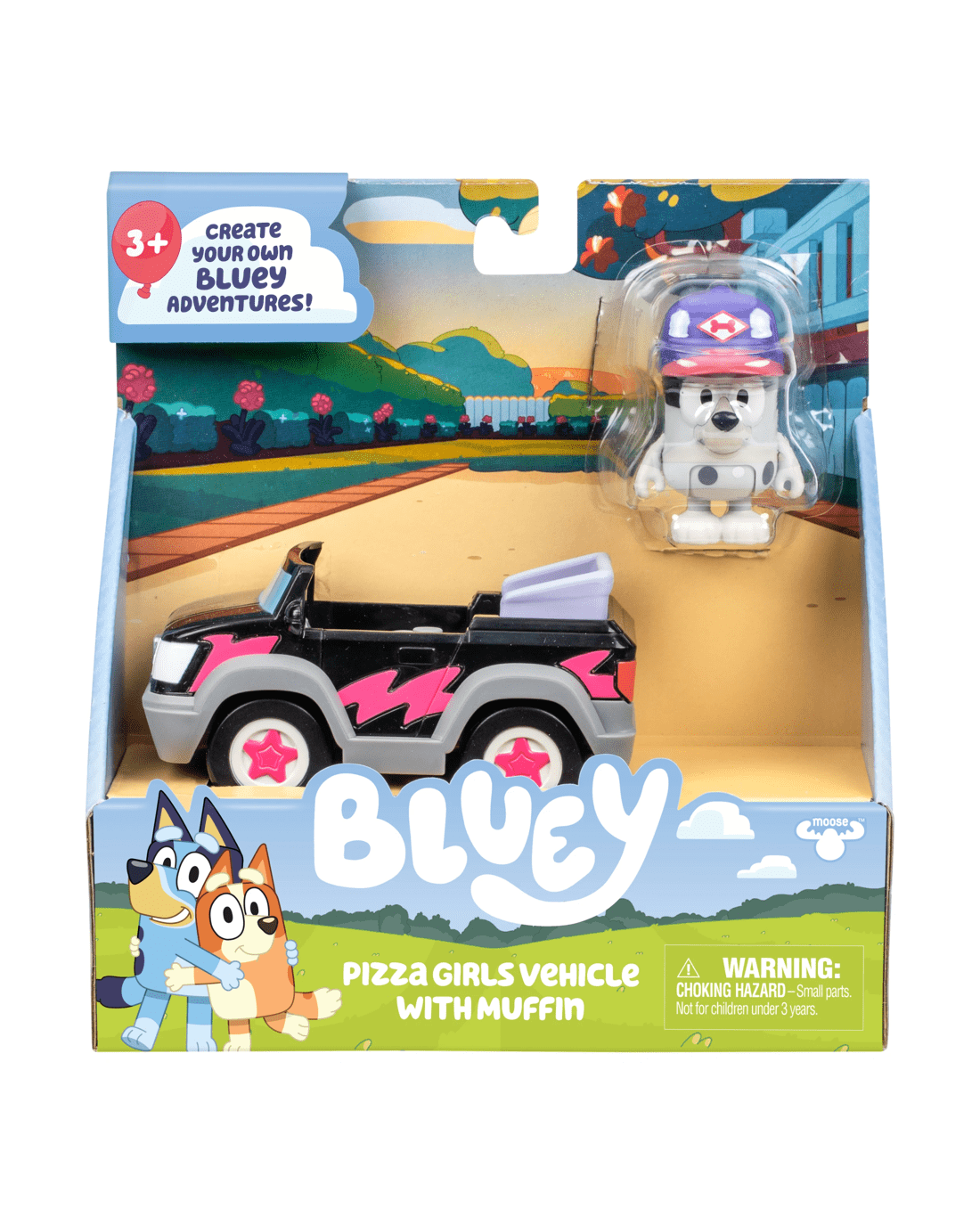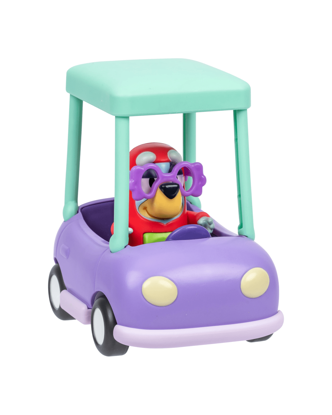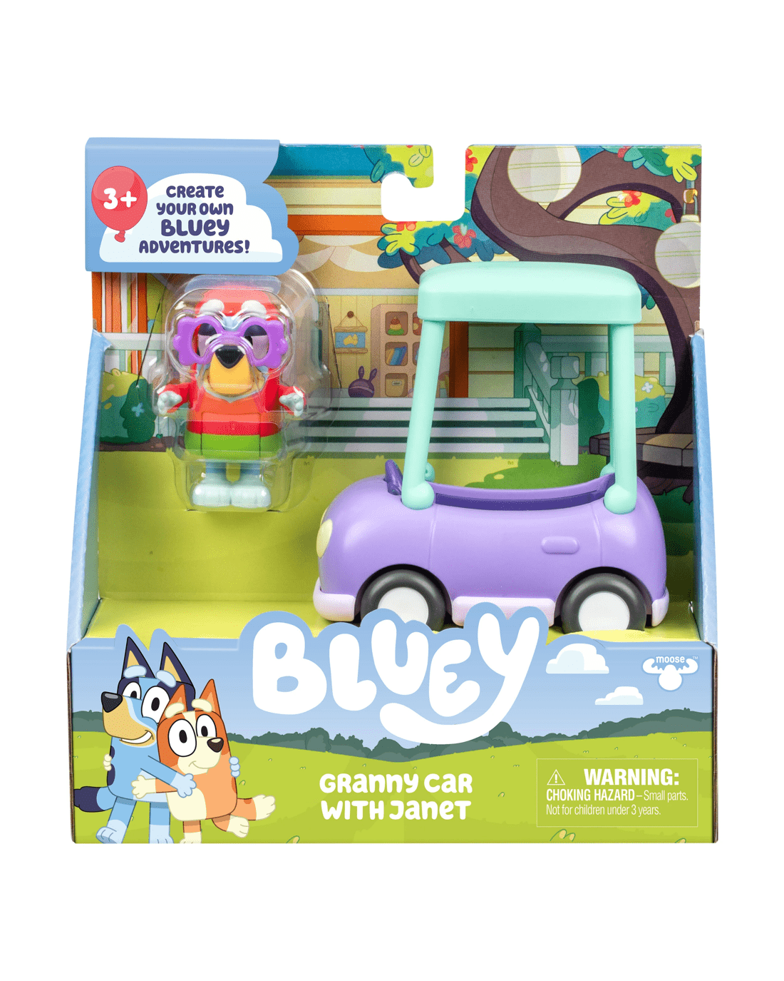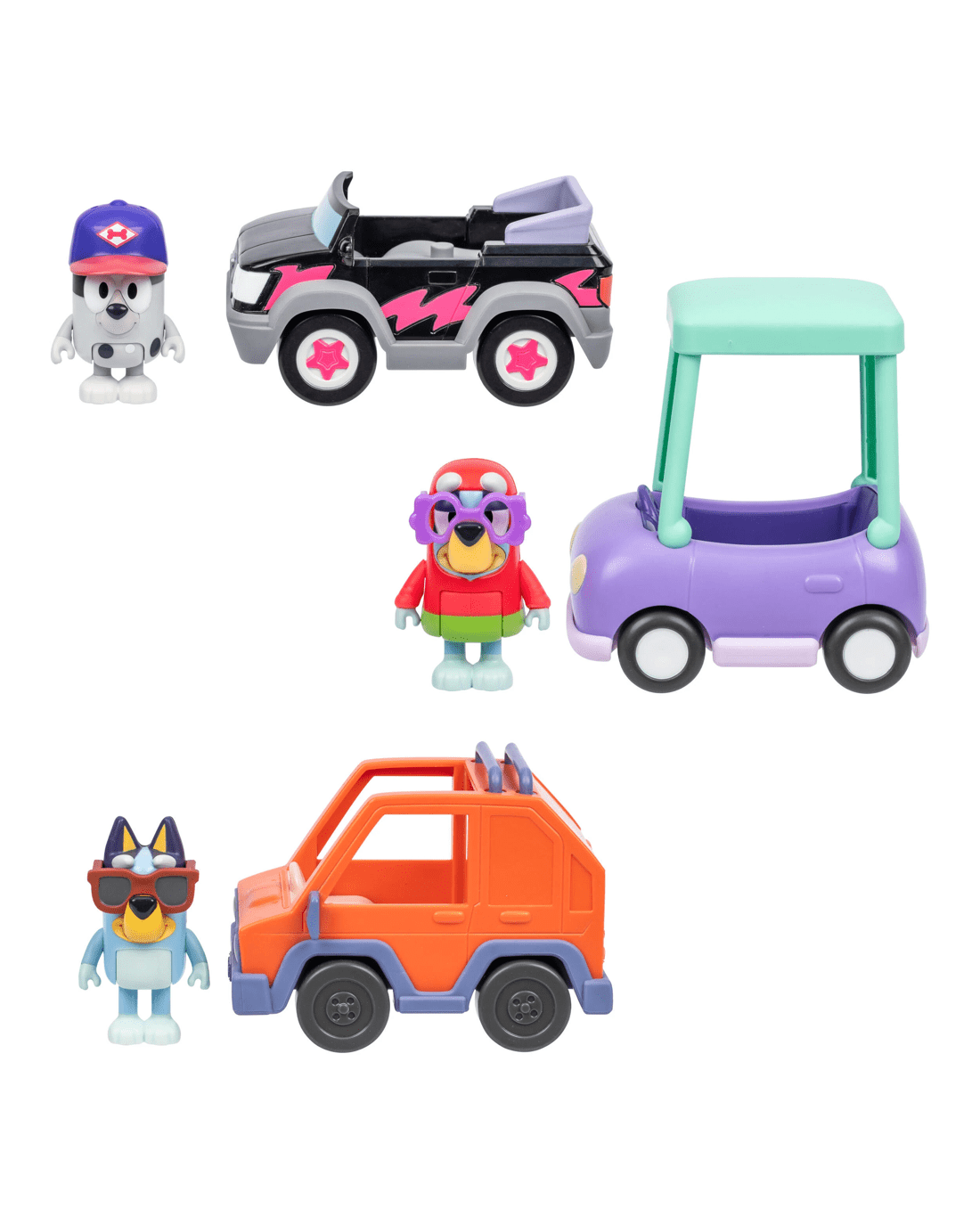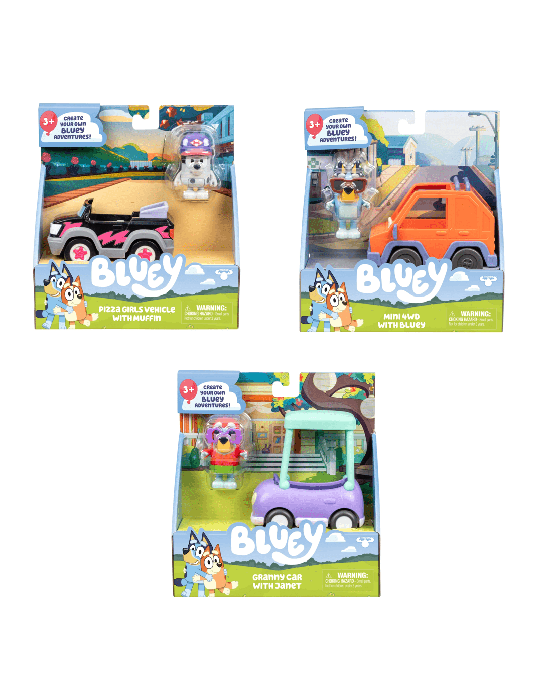 Hit the road with Bluey and her friends in the new Bluey vehicles! Choose from 3 fan favourite rides from different episodes - Pizza Girls Car with Muffin, Grannies Car with Janet and 4WD with Bluey. Each vehicle fits one 2.5 to 3-inch (6 to 7.6cm) figure inside. Kids will love to roll down the road with their favourite characters! With moving arms and bodies, they are the perfect size for preschooler's and toddler's hands. Children will love using these fun-filled cars to recreate some of the most memorable moments from the show and make up new adventures.