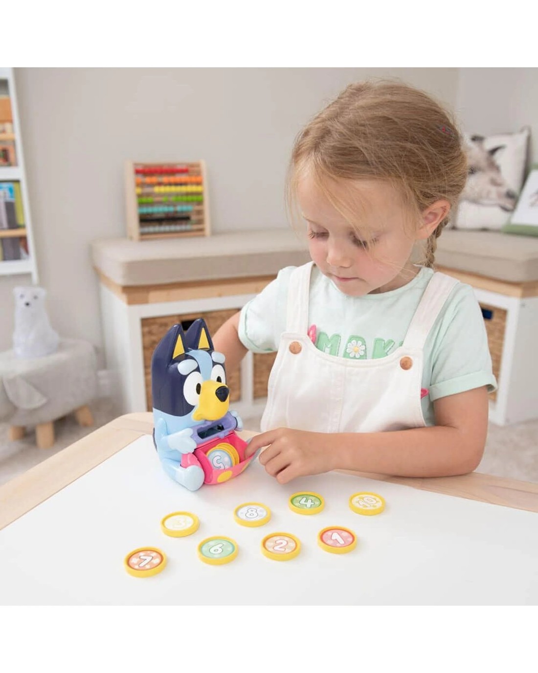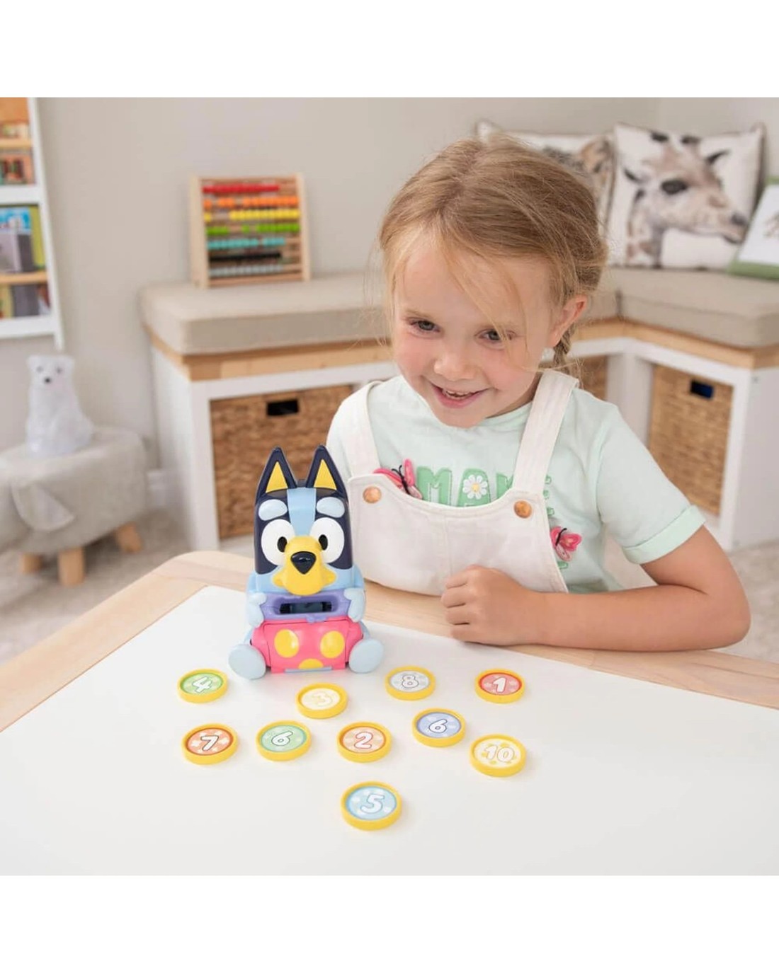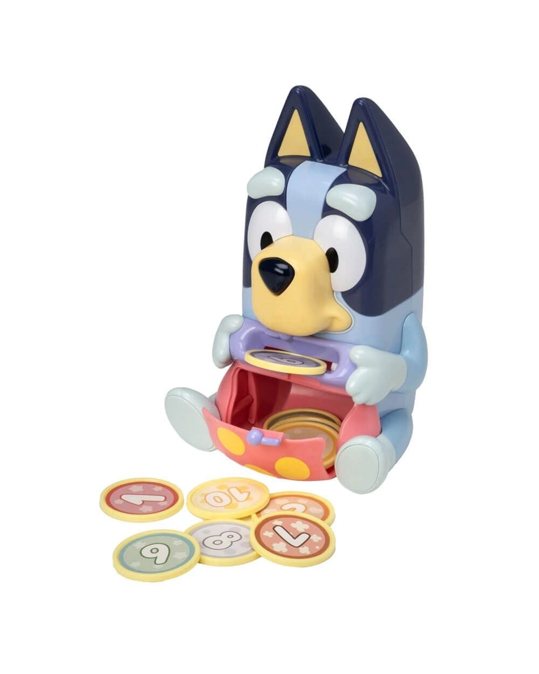 The Save with Bluey toy is shaped just like Bluey from the show and it includes 10 numbered coins. Insert coins to hear different sounds effects and character sounds. Simply open the purse to retreive the coins and start all over again! Press Bluey's nose to hear the Bluey theme tune. Ages 2 +