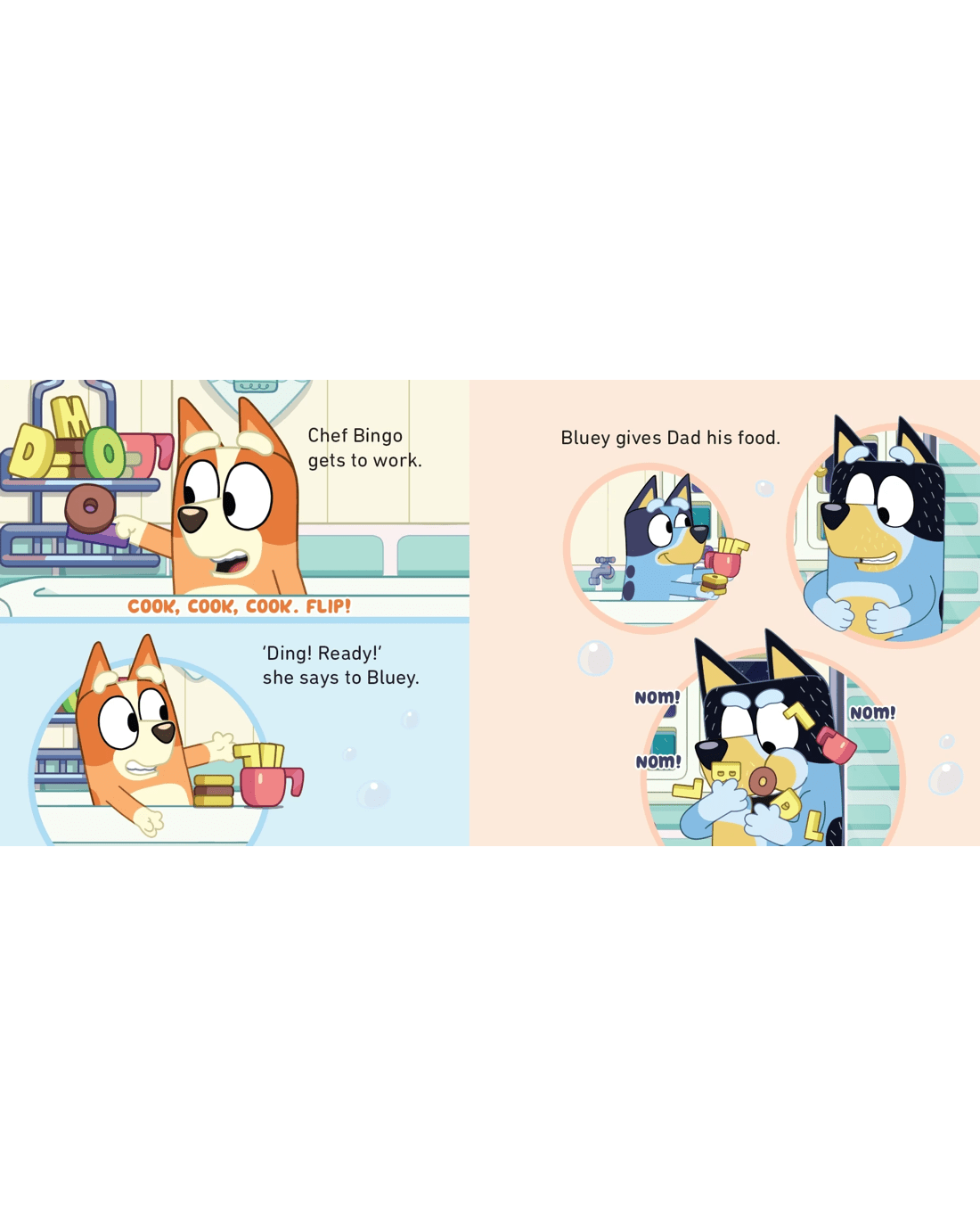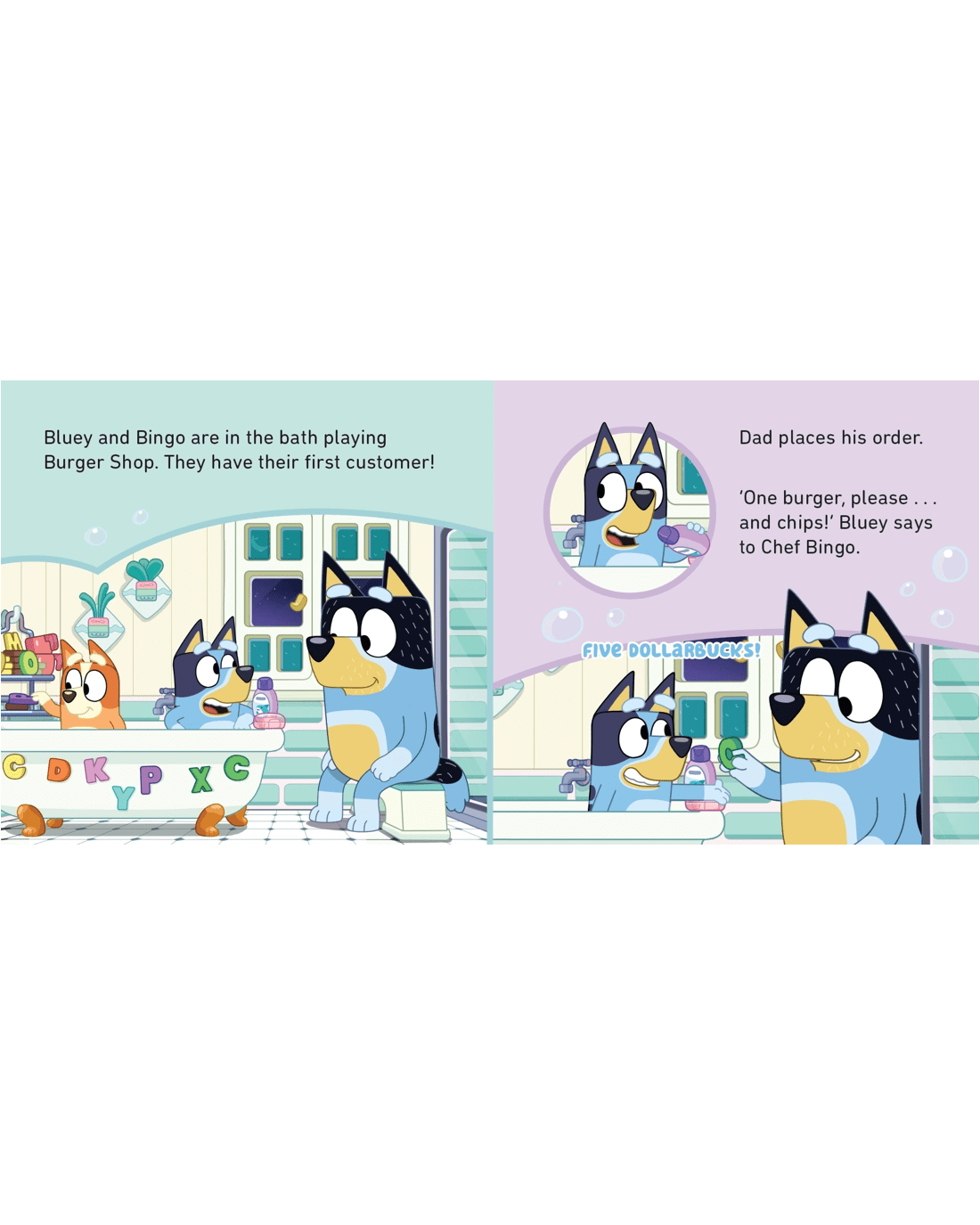 Join Bluey and Bingo for a game of Burger Shop at bathtime with your own bath book!