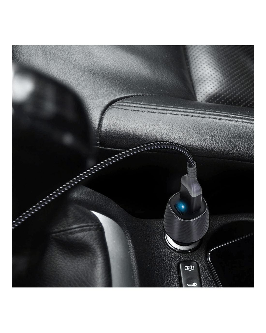 - This charger has a black, premium carbon fibre styled finish to enhance your car interior.