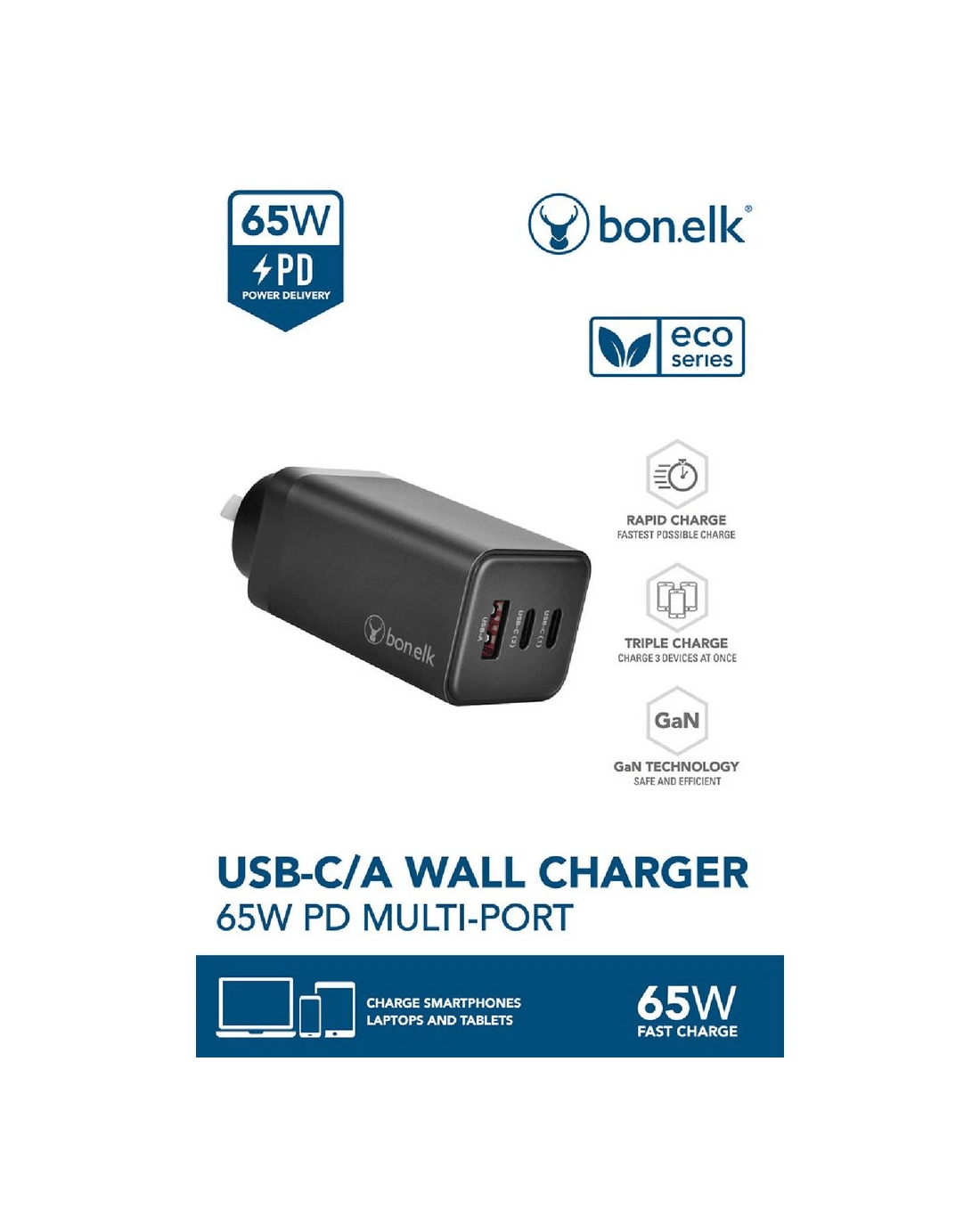 Sold by OfficeworksBonelk Eco Wall Charger 3x USB-C 65w Black