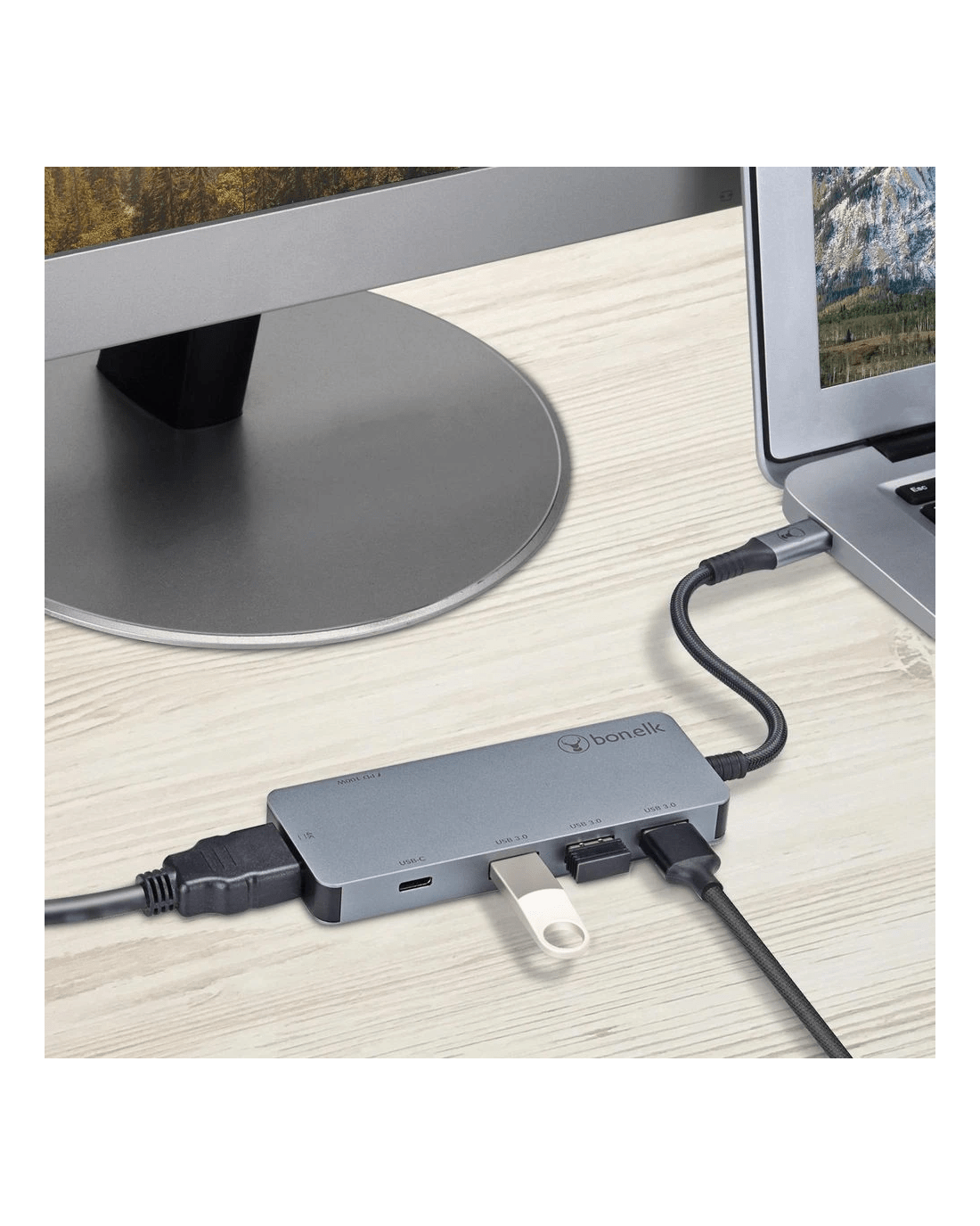 Never worry about compatibility again with this Bonelk Long-Life 6-in-1 Multiport Hub that allows you to convert your USB-C port into a variety of 6 additional ports. The high grade aluminium casing is not only aesthetically pleasing but is accompanied by a braided nylon jacket and FLEX-SR strain relief cable for added durability.
