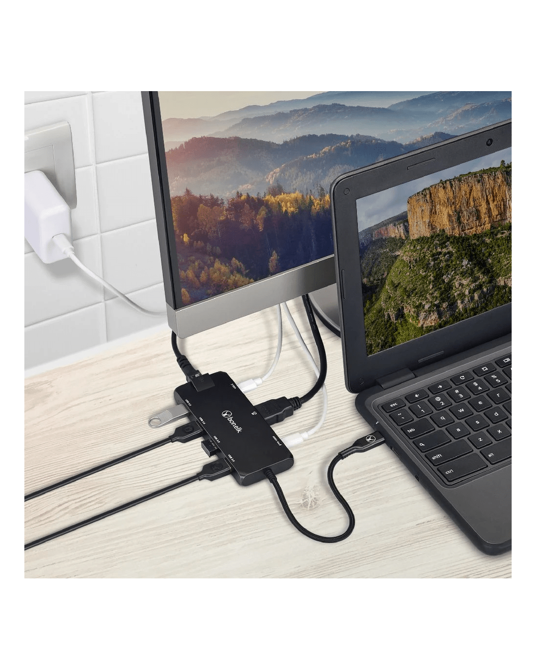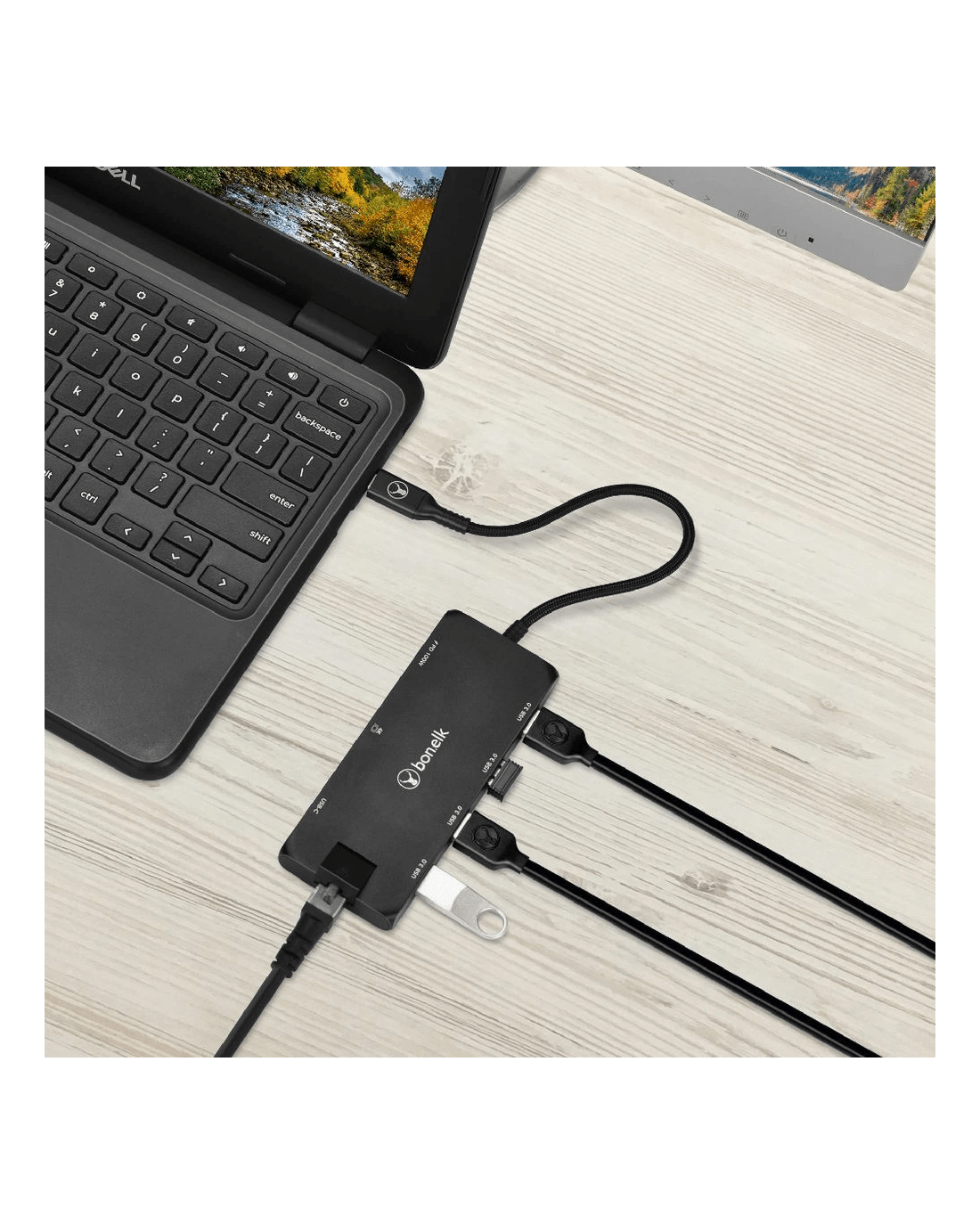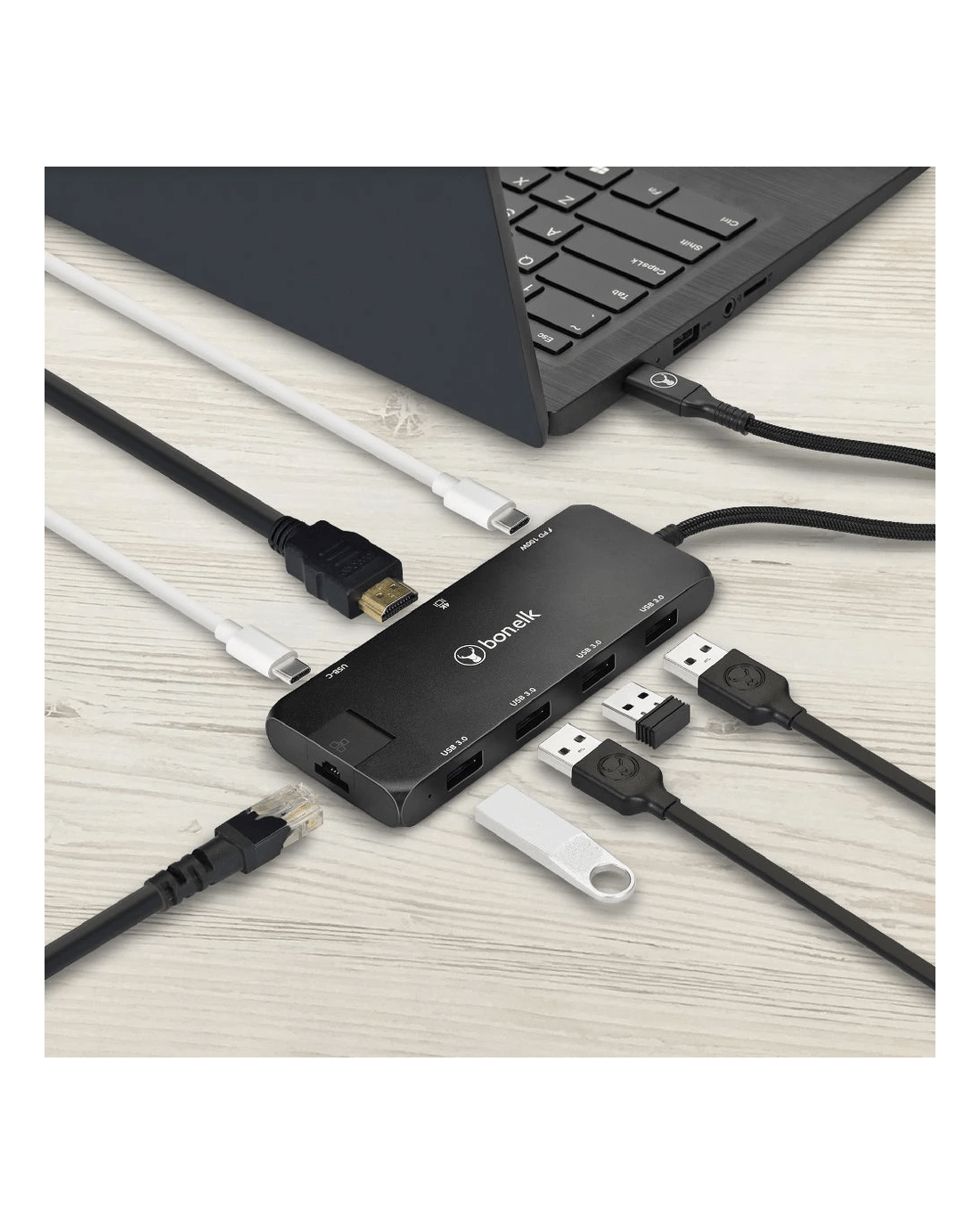 - This Bonelk 8-in-1 multiport hub offers connections via HDMI (4K @ 30 Hz, Full HD 1080p @ 60 Hz), Gigabit Ethernet (10/100/1000 Mbps), 2 x USB-C (Data Transmission, PD Charging 100 W), RJ45 and 4 x USB-A 3.0 ports (SuperSpeed 5 Gbps).