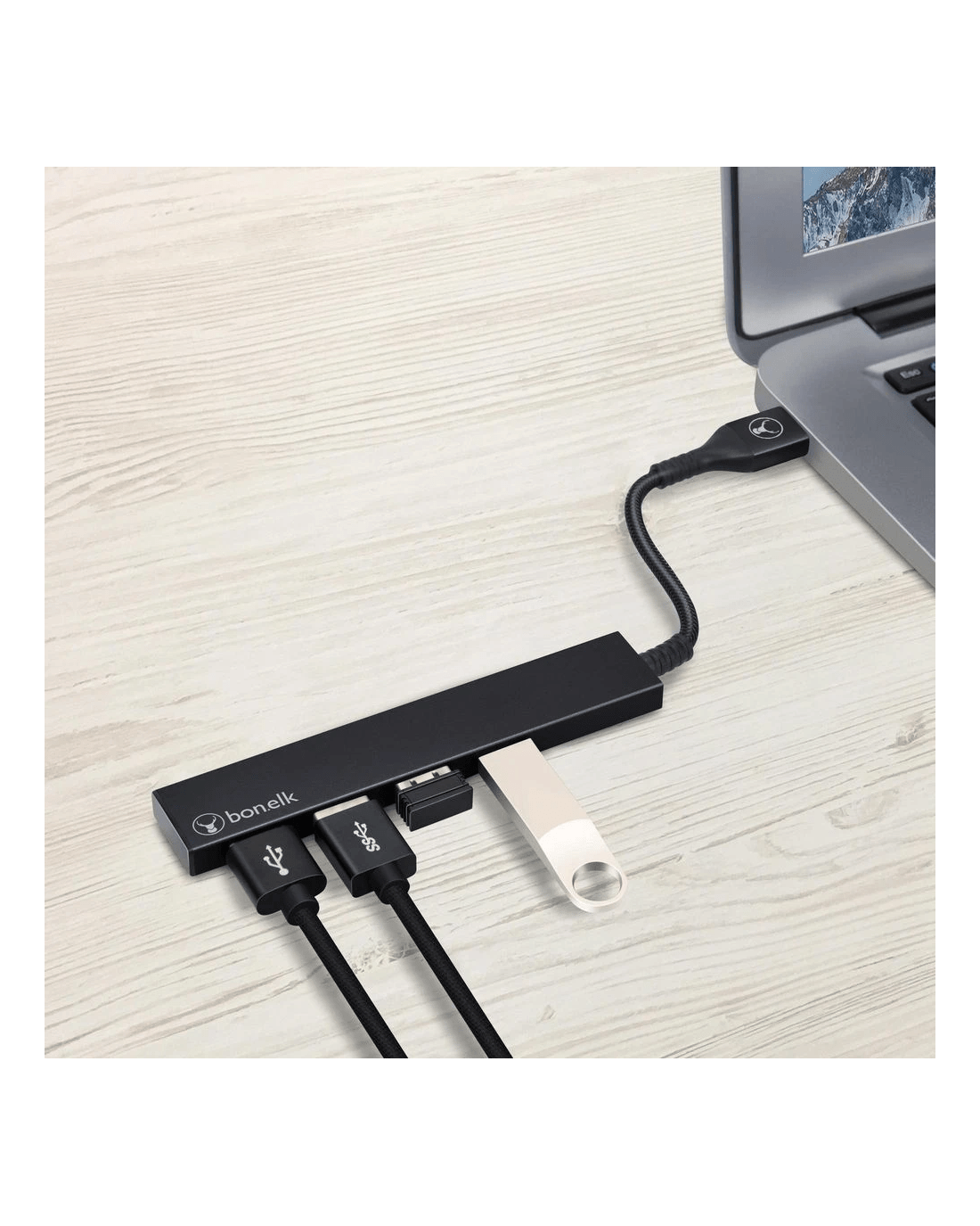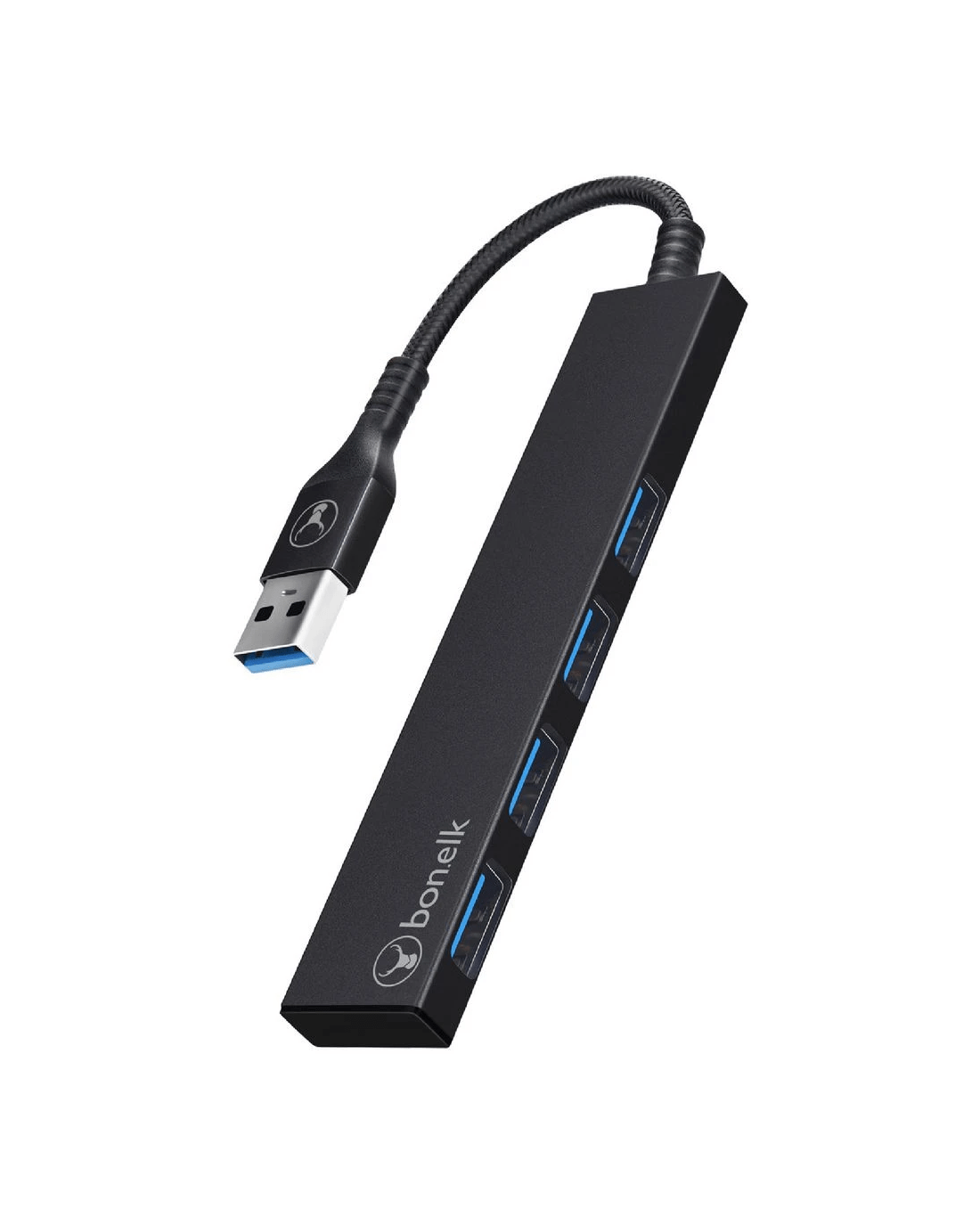 The Bonelk USB Hub is a great addition to your workspace, allowing the increase of your connectivity options. It has 4 USB 3.0 ports that support transfer speeds up to 5 Gbps. It has a long life cable with a braided nylon jacket for durability.