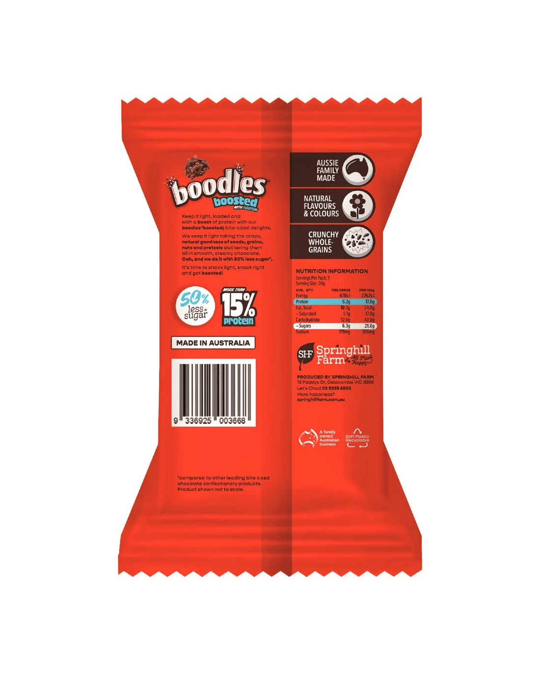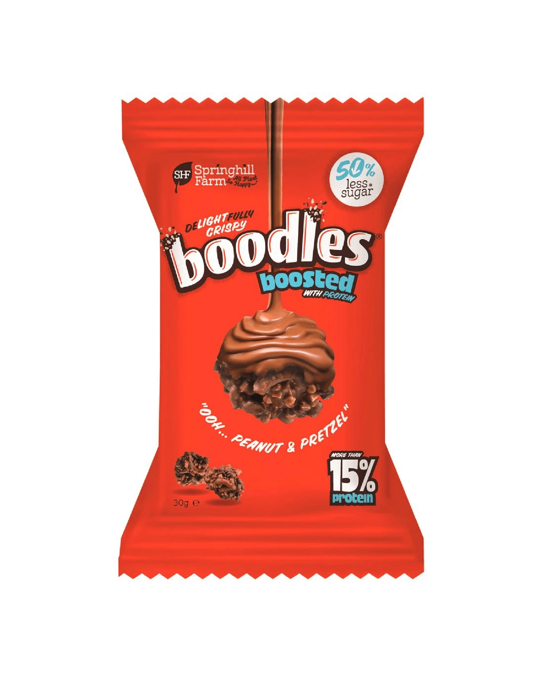 Enjoy a tasty snack on the go with Boodles Boost. This handy pack contains 30 g of chocolate-coated peanuts and pretzels, providing palette pleasing taste and a good source of protein.