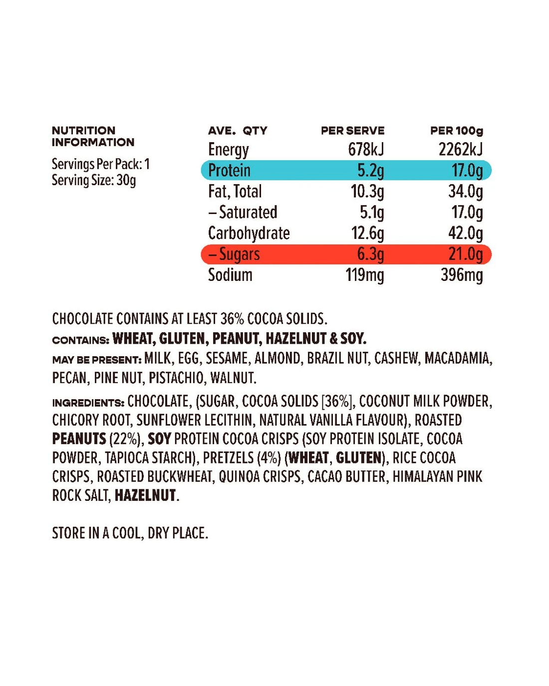 • Ingredients: Chocolate, (Sugar, Cocoa Solids [36%], Coconut Milk Powder, Chicory Root, Sunflower Lecithin, Natural Vanilla Flavour), Soy Protein Cocoa Crisps (Soy Protein Isolate, Cocoa Powder, Tapioca Starch), Cocoa Rice Crisps (Rice Flour, Sugar, Cocoa Powder, Salt), Quinoa Crisps (Quinoa Flour), Chocolate Chips (Sugar, Cocoa Solids, Cocoa Butter, Soy Lecithin, Natural Vanilla Flavour), Roasted Buckwheat, Cocoa Butter, Sprinkles (Natural Colours [Carotene, Anthocyanin, Curcumin, Chlorophyll]).
