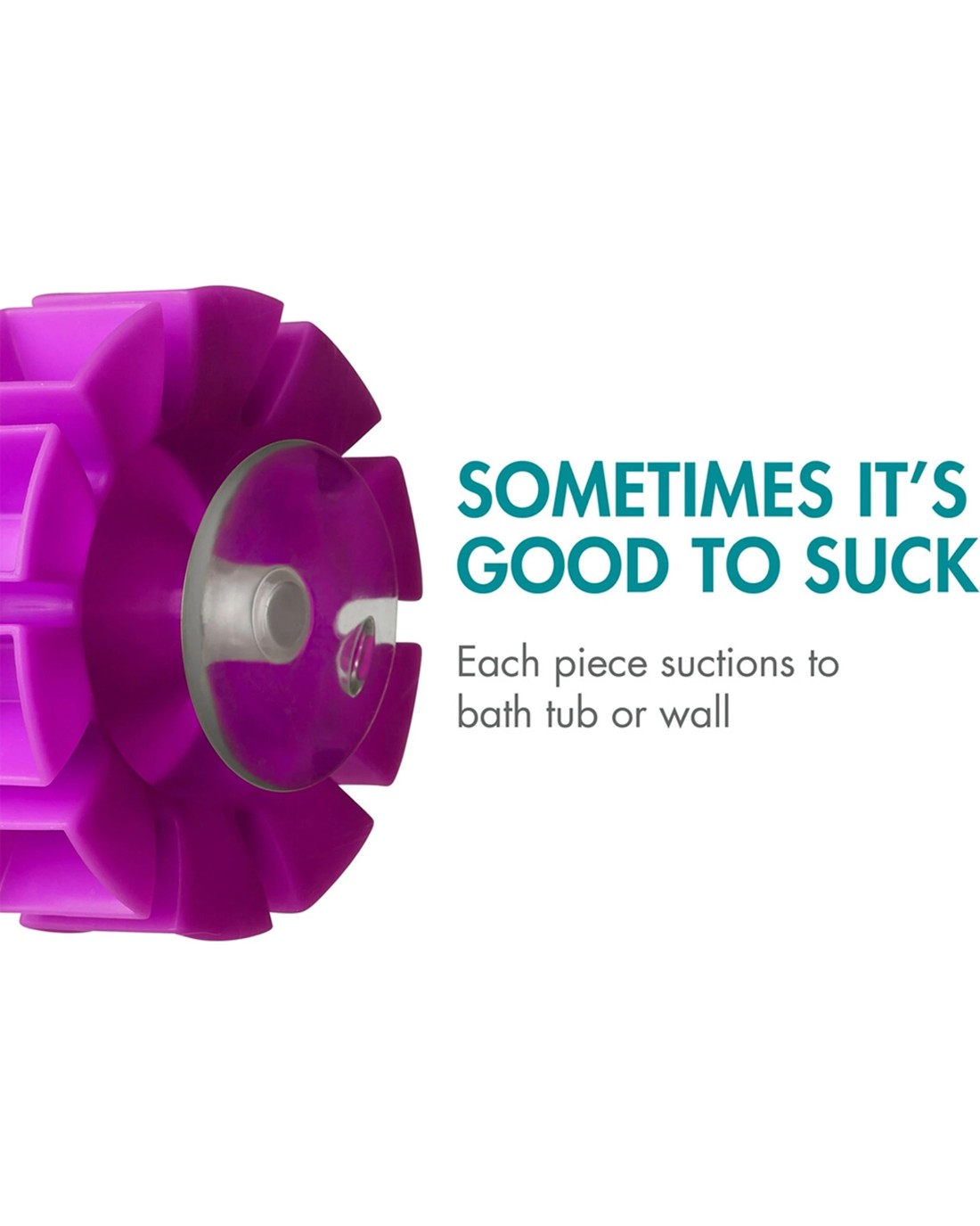 Each tube and pipe interacts with water differently for plenty of ways to experiment. Boon COGS completes this set for maximum bath time fun. They spin when water is poured over them. Positioned just right, they'll run like a fine-tuned machine. These bath toys suction to the wall so the water goes back in the tub, not on the floor. With all of this to play with, the only challenge will be getting your little gear head out of the tub.