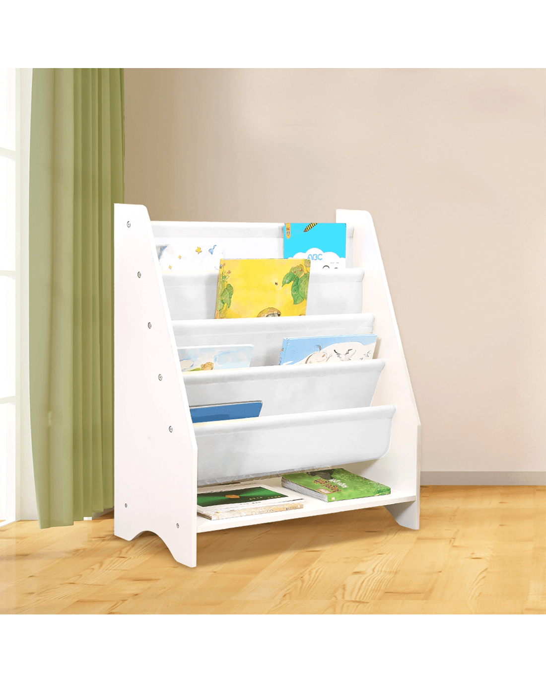 The Bopeep kids bookshelf is a stylish and practical way to organise your child's favourite books. Designed with four soft fabric slings and a bottom shelf, this kids bookshelf is easy for toddlers to use and perfect for any playroom or bedroom.