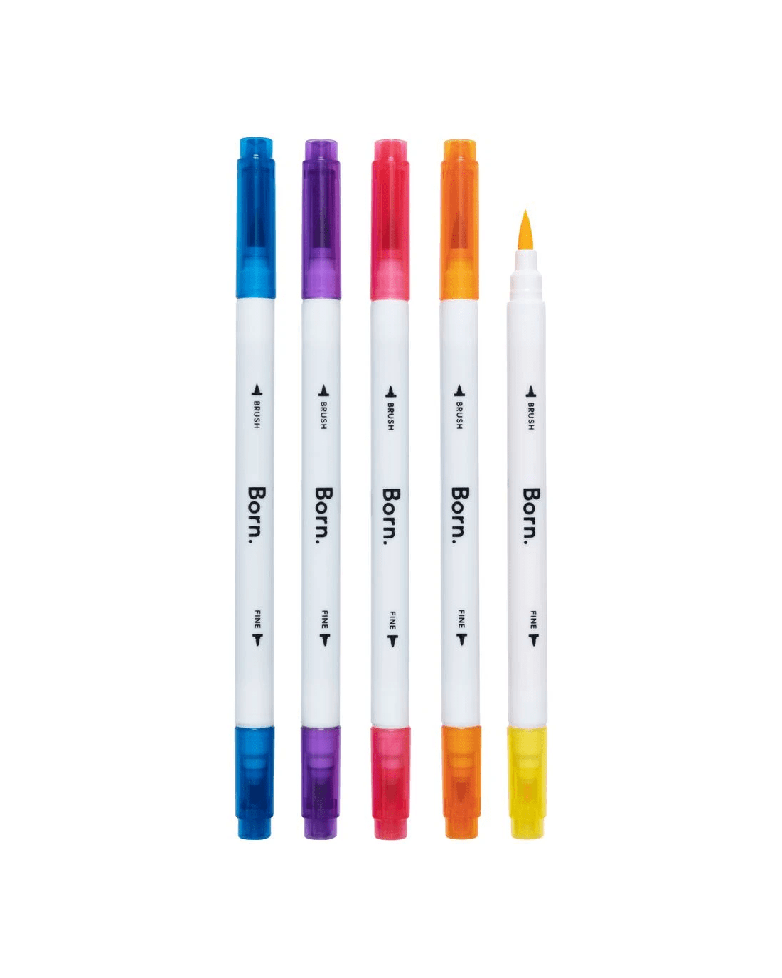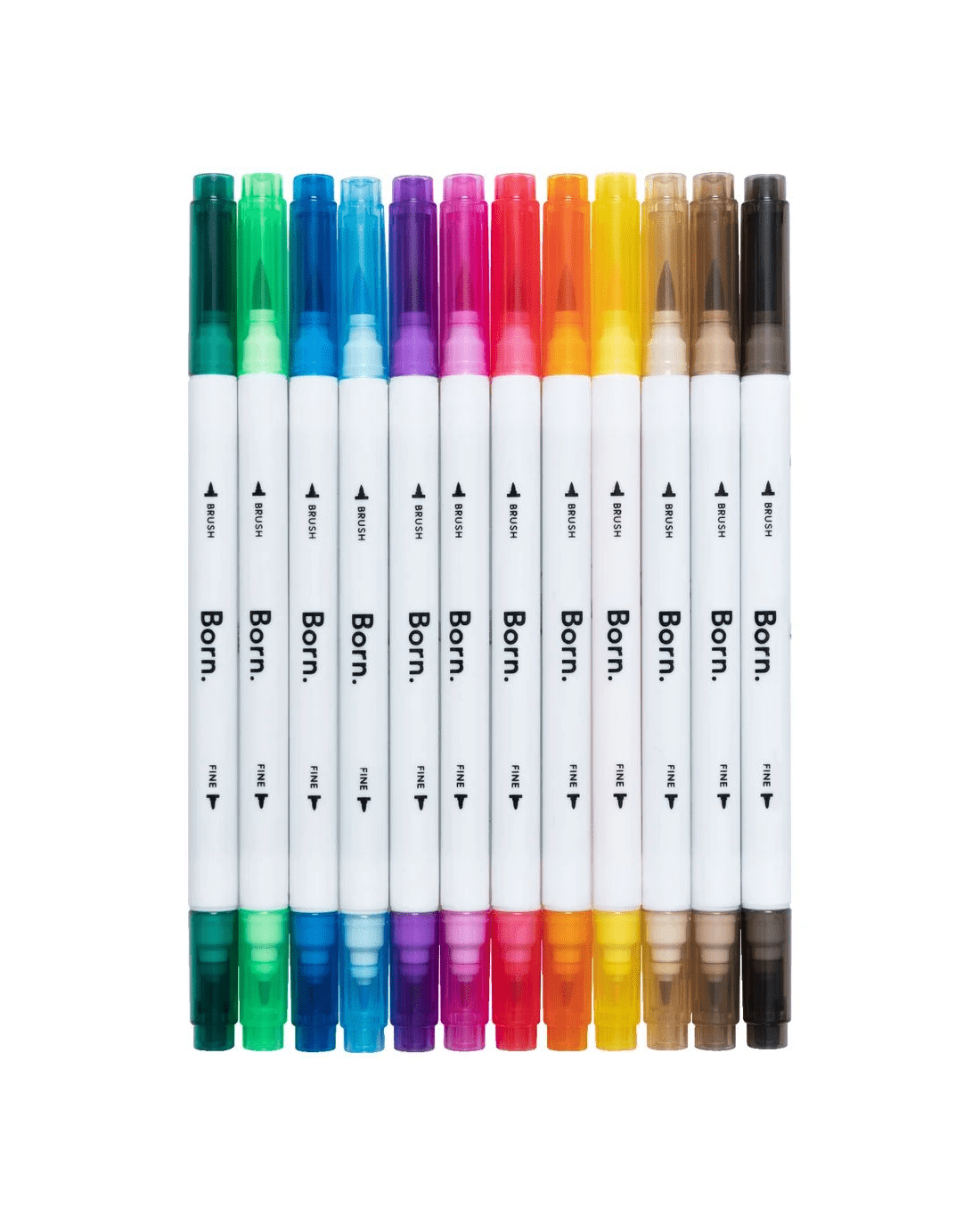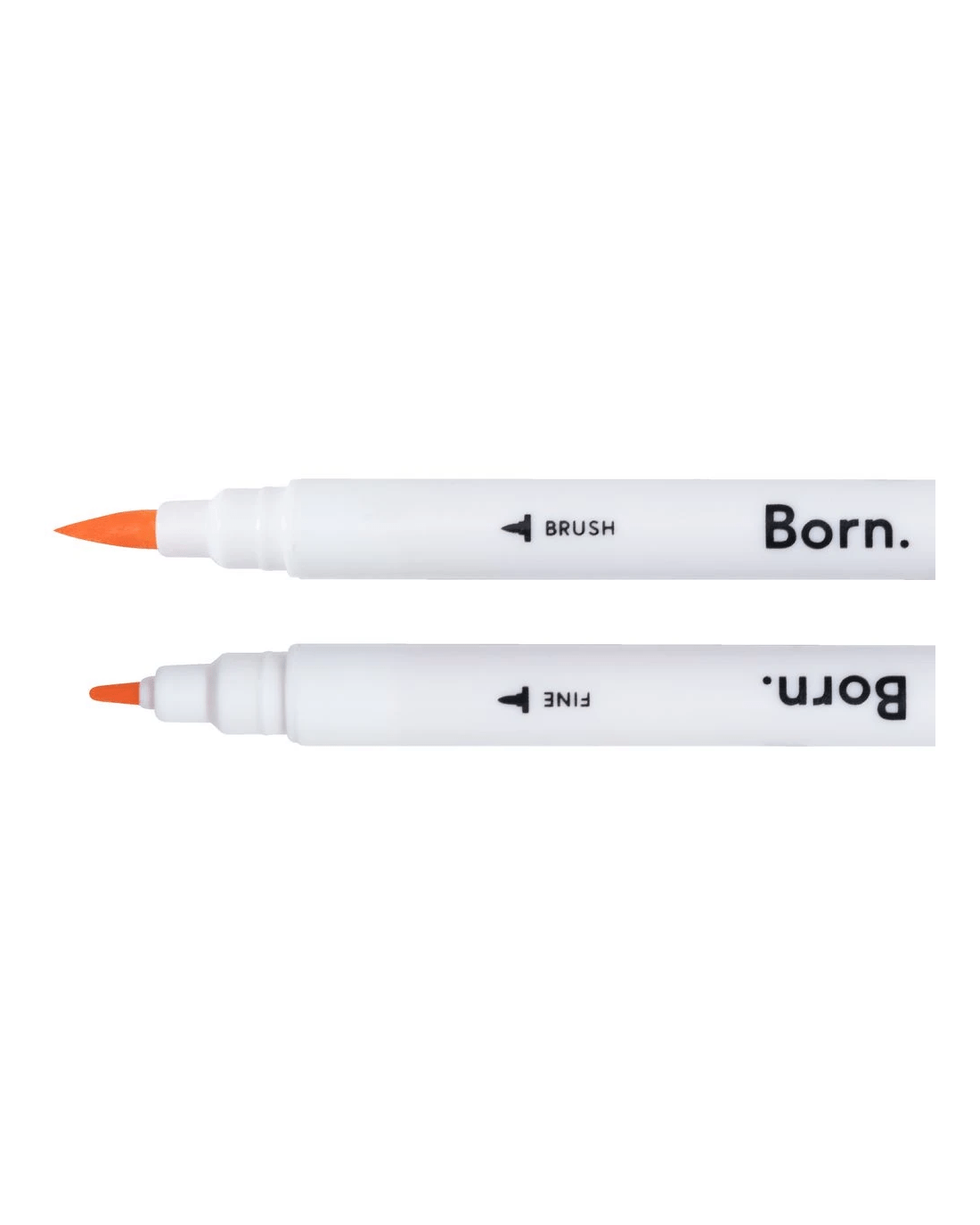 These Born Dual-Tip Brush Markers feature water-based ink and a round barrel for comfort and control. One side has a fine tip, while the other side has a brush tip, allowing you to create different strokes and effects.