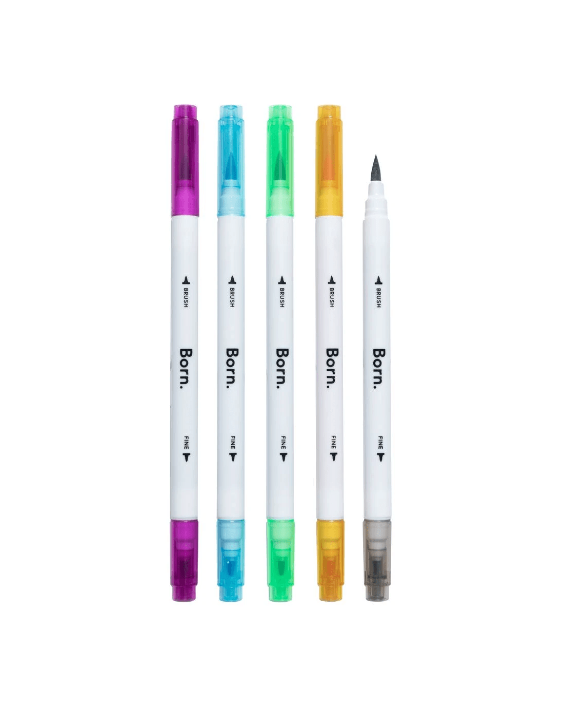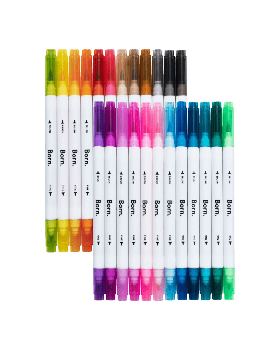These Born Dual-Tip Brush Markers feature water-based ink and a round barrel for comfort and control. One side has a fine tip, while the other side has a brush tip, allowing you to create different strokes and effects.