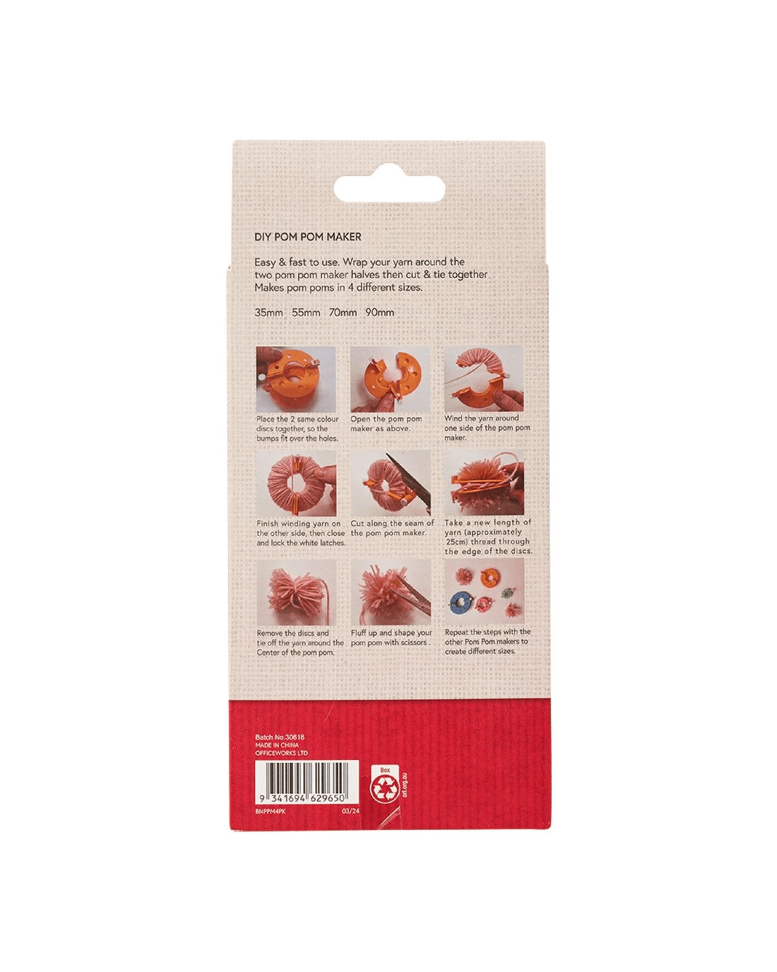 • This pack contains 4 makers for 35 mm, 55 mm, 70 mm, and 90 mm pom poms.