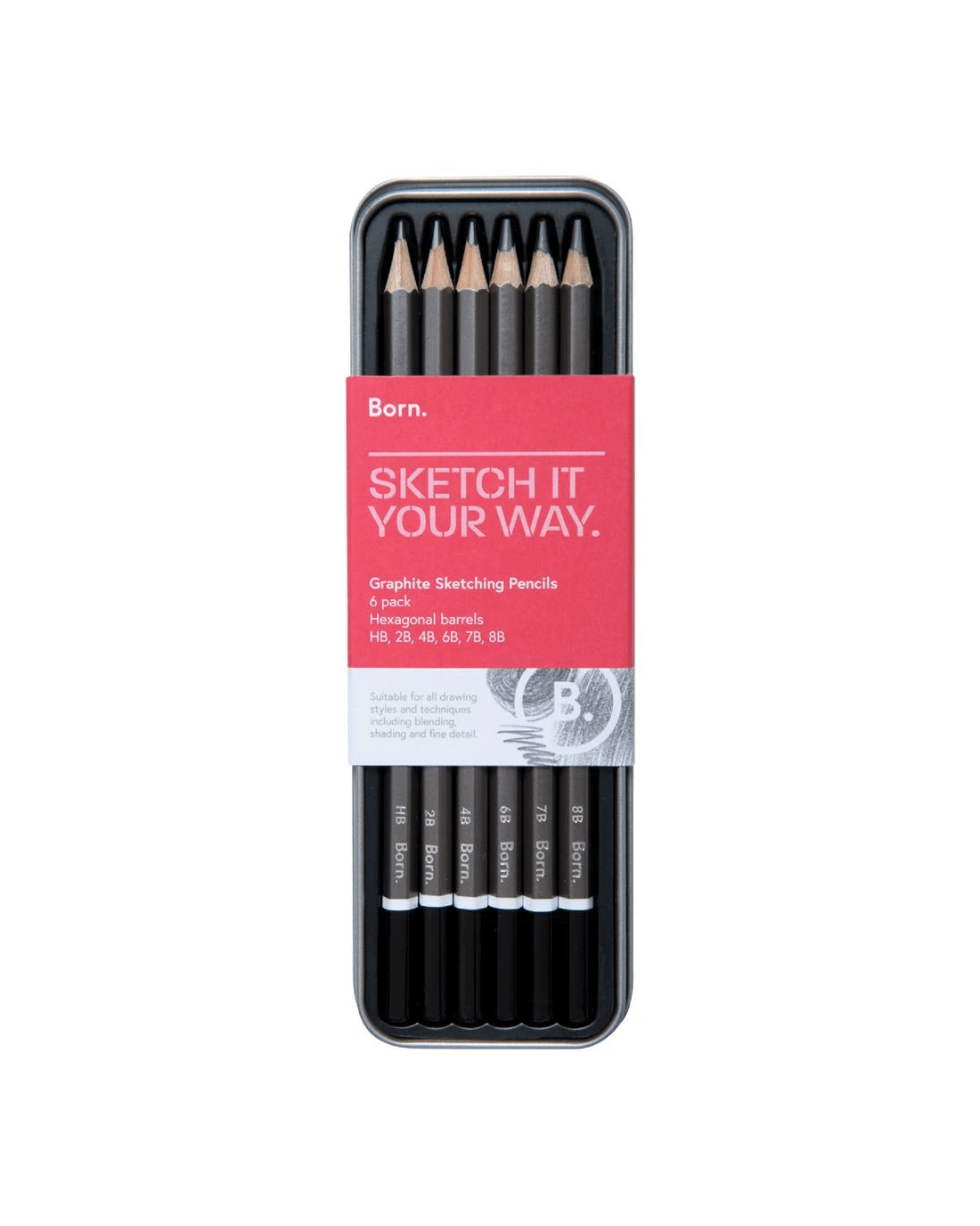 Create detailed portraits with this Born Sketch Graphite Set. This set comes with 6 graphite pencils for you to get sketching with. The graphite leads are protected by wooden barrels and can be stored in the included tin to prevent breakage.