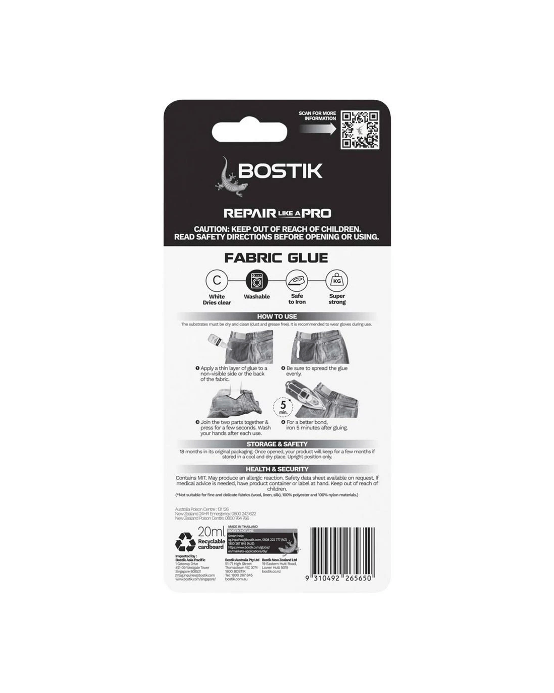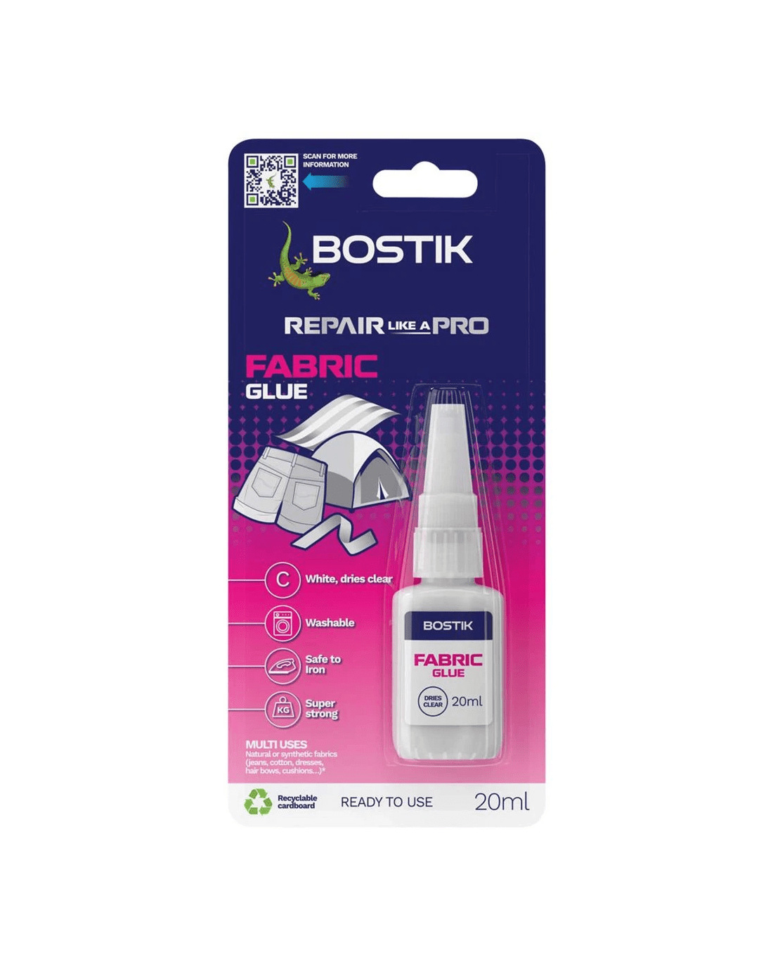 Bostik Fabric Glue is a permanent adhesive for clothing, fabric repairs and crafts. It's suitable for using on porous fabrics including cotton, denim, linen, felt, leather, PVC and much more. It can also withstand machine-washing and ironing.