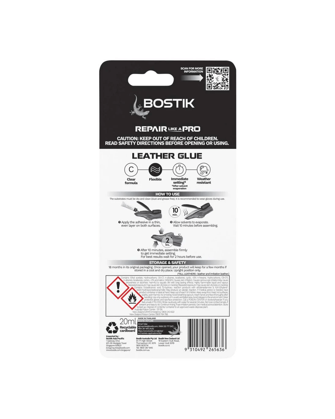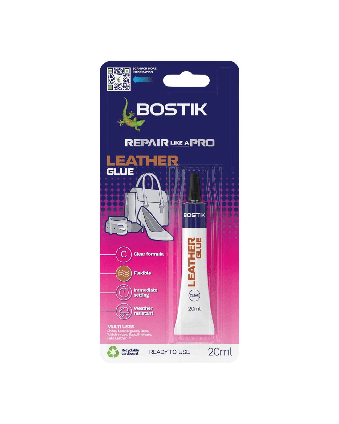 This Bostik Leather Repair Clear Glue is an ultra strong, quick drying, water resistant, clear adhesive. It's ideal for making long lasting repairs to leather or imitation leather items such as shoes, belts or bags. It's also suitable for use on PVC.