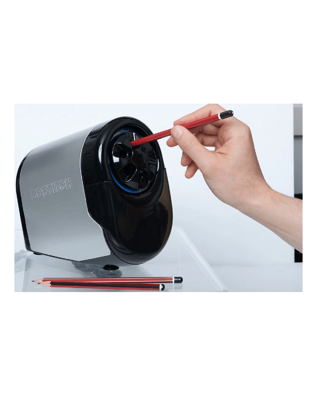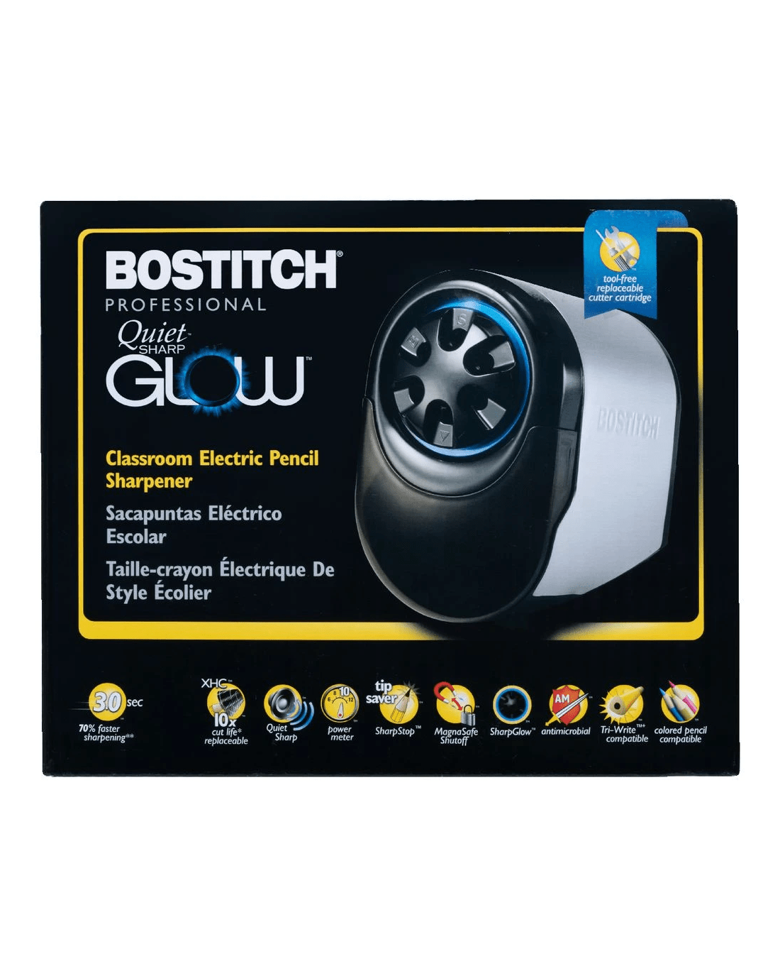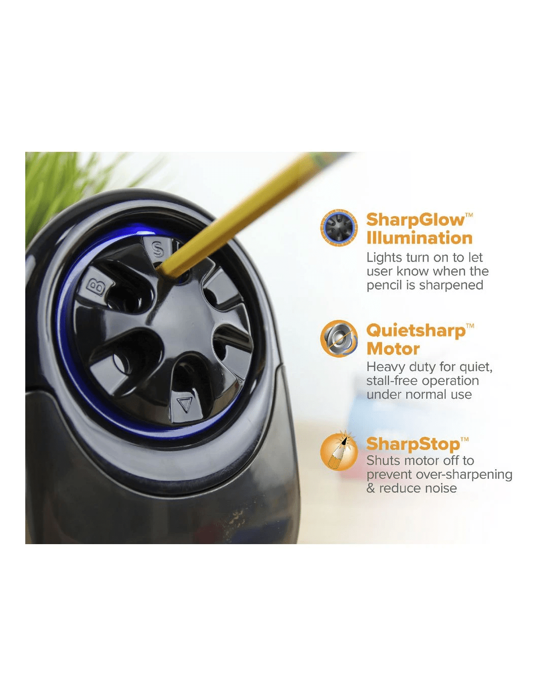 Keep your art class pencils sharp with this Bostitch Classroom Electric Sharpener. This sharpener has a QuietSharp motor that limits classroom or office distraction. It has standard and jumbo holes for all types of pencils and a SharpGlow indicator light that let's you know when the job is done.
