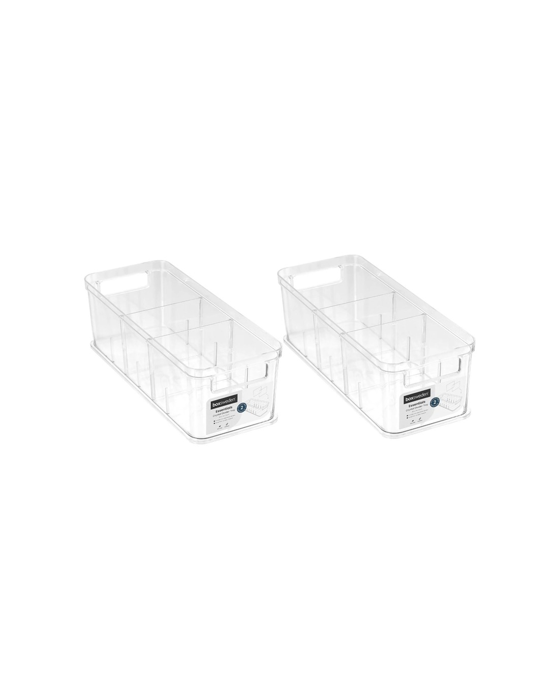 The BOXSWEDEN Crystal 35x14cm Storage Tray Adjustable Dividers 2 Pack is designed for organising small items efficiently. These durable, crystal clear trays help you keep your space tidy with ease while offering visibility of contents at a glance.