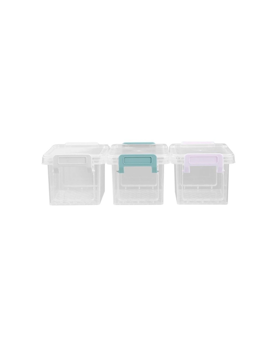 Each box features a durable, BPA free construction with a 330ml capacity. The stackable design allows for flexible storage options, and secure latching handles ensure your items stay safely contained. Transparent material provides clear visibility of contents for quick identification, while colour-coded handles in white, pink, and green enhance organisation.