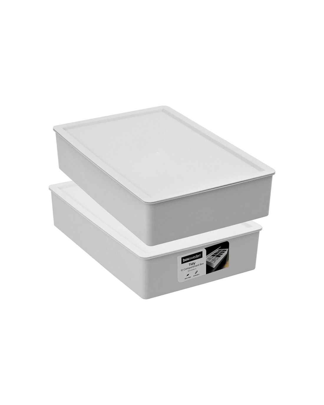 The Boxsweden Tidy 12-Compartment Storage Box is designed for organising your household or office items efficiently. These versatile storage boxes are ideal for decluttering and keeping your space neat and tidy.