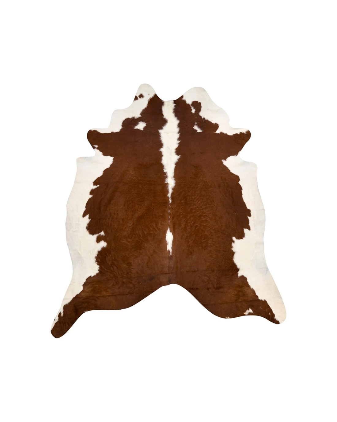 The rug features an irregular shape with a predominantly brown colour accented by white patches along the edges and a white stripe running down the centre, making each piece one-of-a-kind. Some rugs may have markings, branding, or patches on the underside, which are natural and add to the authenticity of the product.