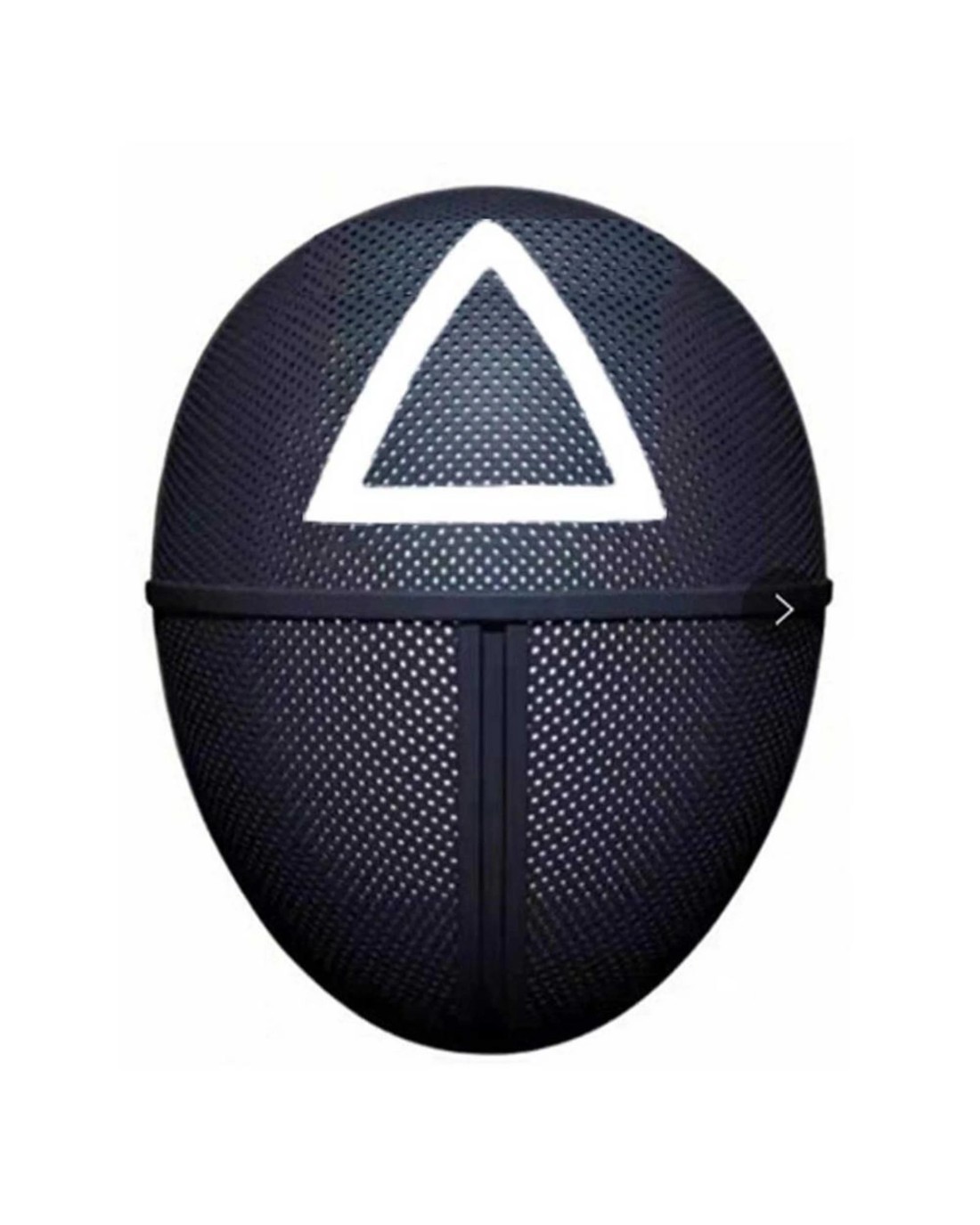 Black plastic character mask with a grated front to maintain vision.