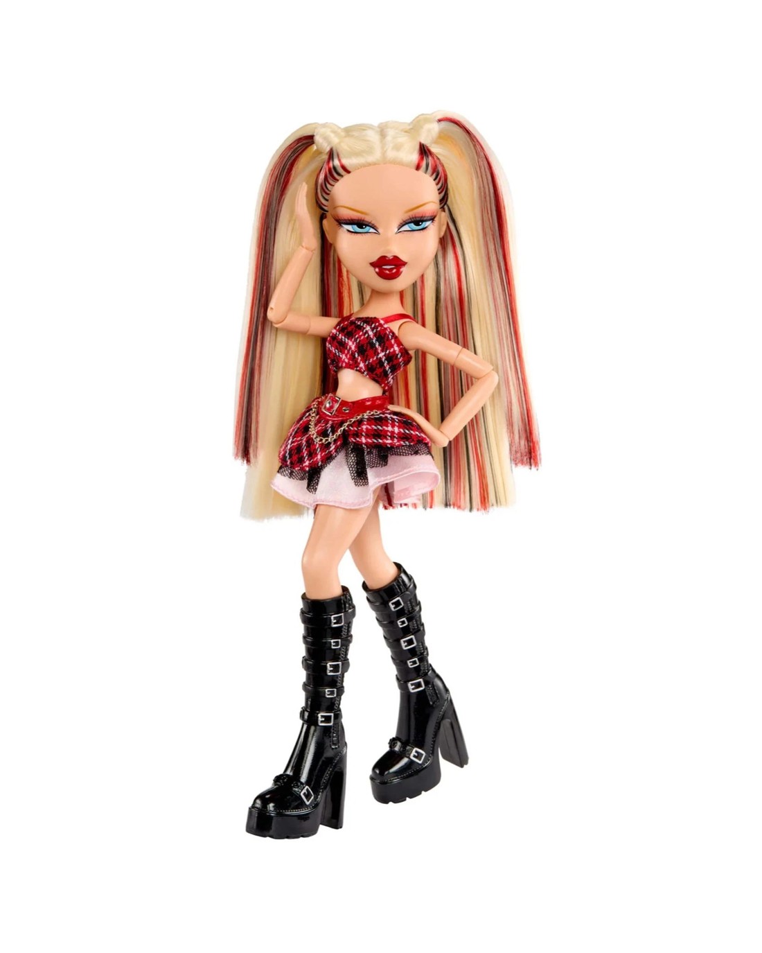 The girls with a passion 4 fashion were working late on Bratz Magazine when they drifted into a totally wild dream! In this dream world, their Pop Starz alter egos came to life, and they became the hottest new girl group — the Bratz Angelz! With fresh sounds and bold new looks, bratitude is stepping into the spotlight. Cloe brings edgy attitude to the group, selling out stadiums with her electrifying guitar solos. This punk princess proves even angels can rock out! Cloe rocks a bold leather jacket with exaggerated shoulders. Her layered skirt mixes black lace and plaid, accented with a red belt featuring silver details and a chain. Black buckled platform boots and a silver headset microphone complete her edgy look. Her hair is a half-up-half-down pigtail look with red and black streaks. Her makeup features a bold red lip and a black and red smoky eye. Cloe comes with a Bratz 'B' shaped charm, included for you to add to your bracelet started in the Charmz collection (sold separately) in celebration of Bratz's 25th anniversary! Collect all four Bratz Pop Starz fashion dolls—Cloe, Yasmin, Jade, and Sasha—each with their own collectible charm. Listen to new music from the Bratz Angelz on your favorite music streaming platforms now! Ages 6 +