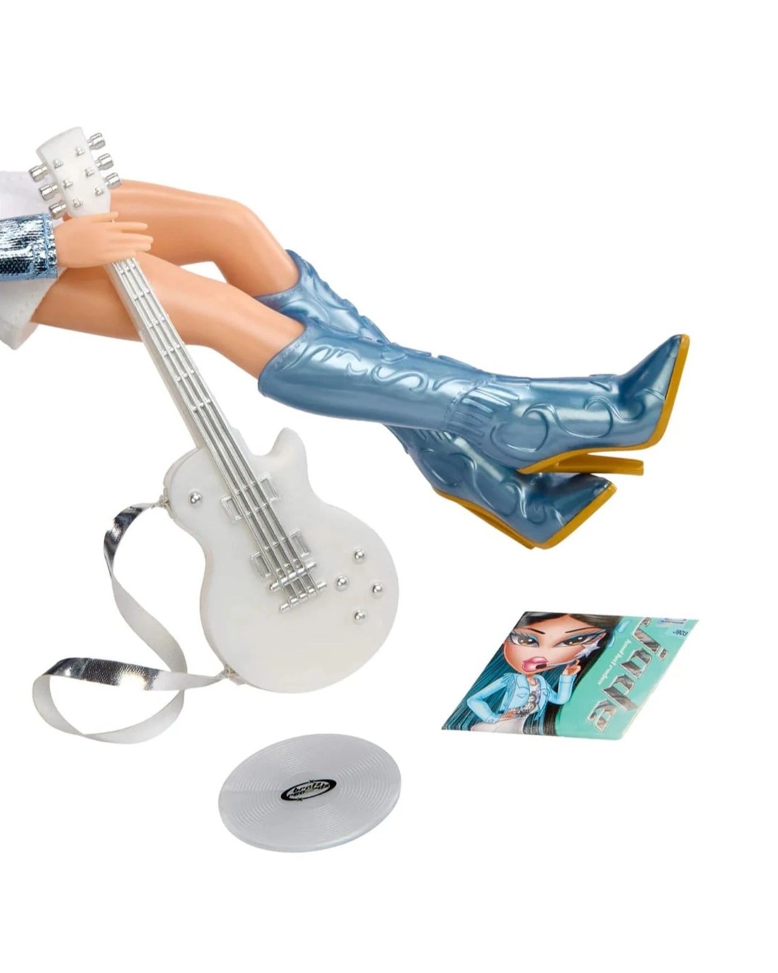The girls with a passion 4 fashion were working late on Bratz Magazine when they drifted into a totally wild dream! In this dream world, their Pop Starz alter egos came to life, and they became the hottest new girl group — the Bratz Angelz! With fresh sounds and bold new looks, bratitude is stepping into the spotlight. This chart-topping superstar combines country-glam style with electronic energy for a totally unexpected sound. Jade rides into the spotlight wearing a shimmering chrome fringe jacket paired with a graphic crop top and a white mini skirt. Her metallic blue cowboy boots perfectly match the soft blue bows in her half-up, half-down hairstyle, with streaks of blue underneath. Her makeup pops with a soft pink lips and a powdery blue eye look. Jade comes with a star shaped charm, included for you to add to your bracelet started in the Charmz collection (sold separately) in celebration of Bratz's 25th anniversary! Collect all four Bratz Pop Starz fashion dolls—Cloe, Yasmin, Jade, and Sasha—each with their own collectible charm. Listen to new music from the Bratz Angelz on your favorite music streaming platforms now! Ages 6 +