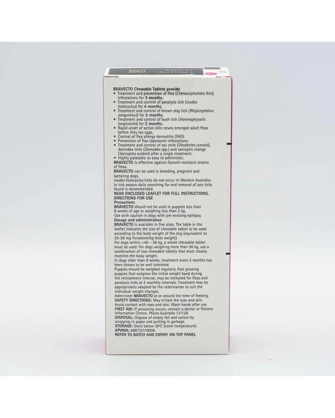 Bravecto Chew for Dogs: • Treats fleas for 3 months • Controls paralysis ticks for 4 months • Controls brown dog ticks and bush ticks for 2 months • Controls mites (demodex, sarcoptes, and ear mites) • Reduces the incidence of flea allergy dermatitis (FAD) by controlling adult fleas • Easy to administer • Safe for use in breeding, pregnant, and lactating dogs