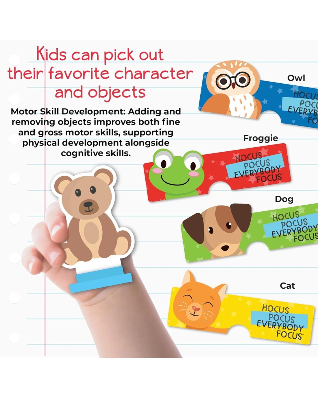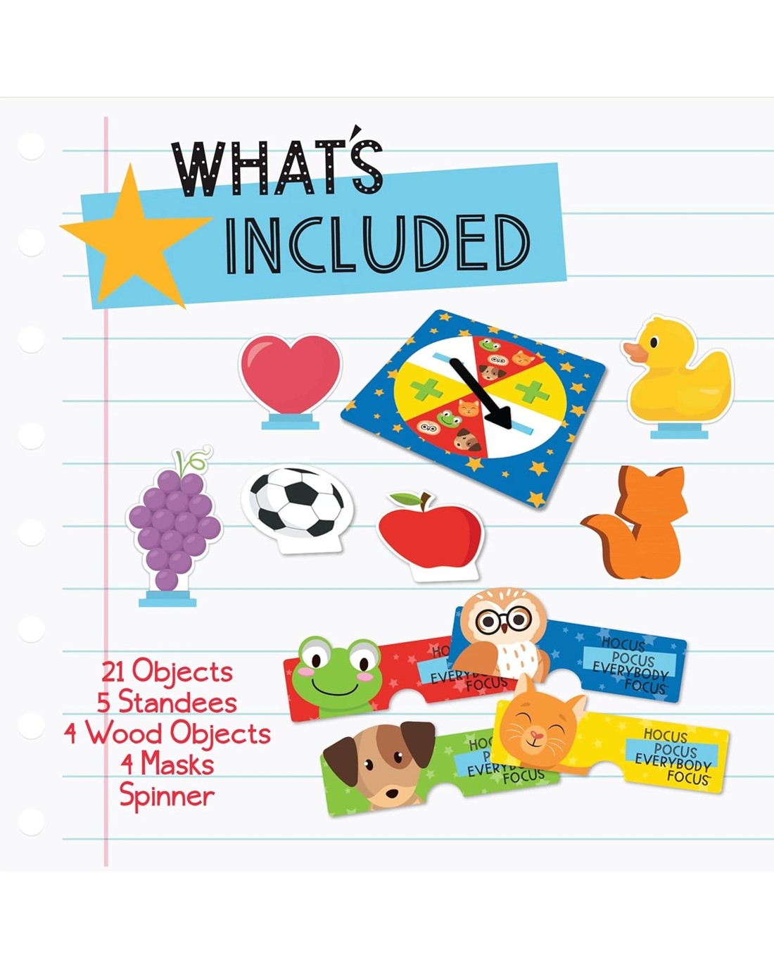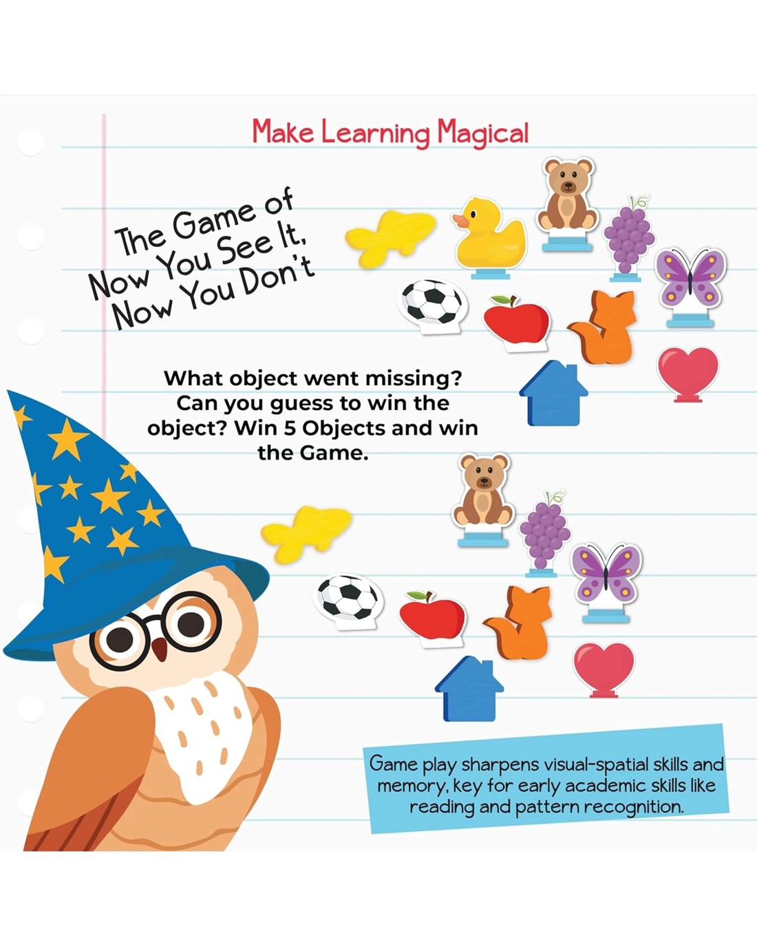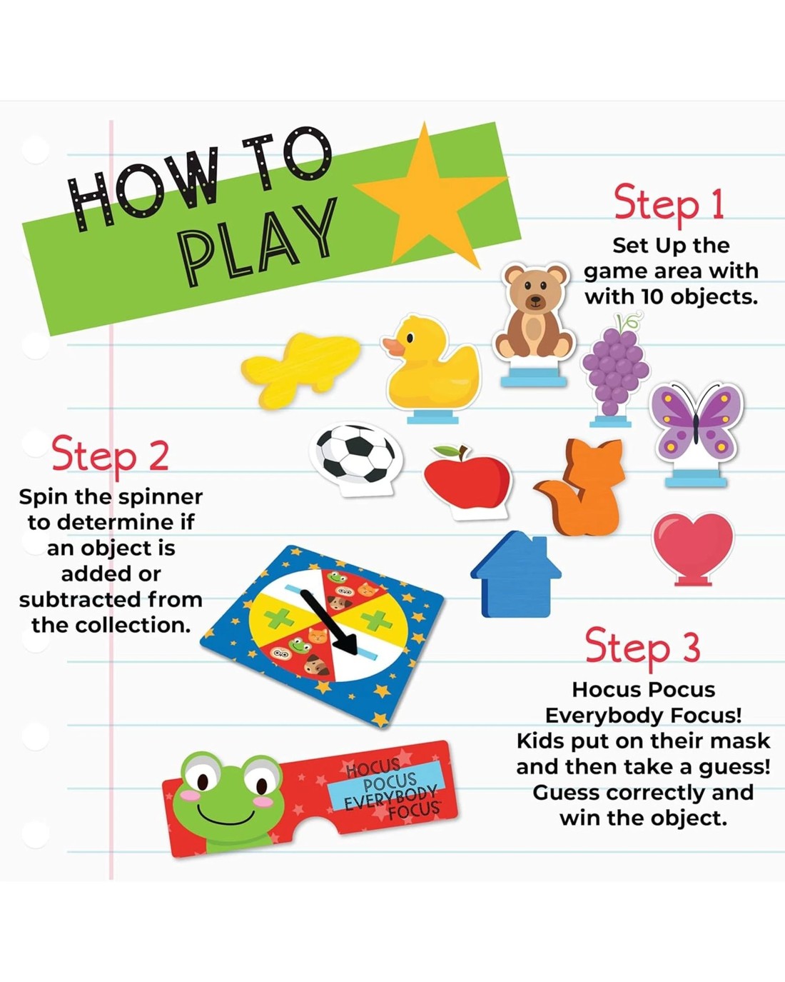 Make Learning Magical! Observe the Objects where they are located. Then, as other players cover their eyes with their Masks, spin the Spinner and add or remove Objects. After saying "Hocus Pocus, Everybody Focus", players remove their Masks and guess what Objects were added or removed to win them. The first player to collect 5 Objects wins the game! Ages: 3 + | Players: 2 - 4