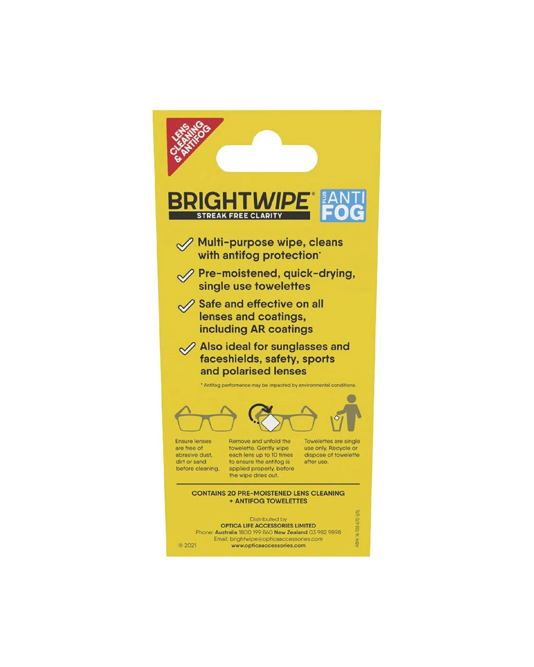 These Brightwipe Anti-Fog Lens Cleaner Wipes have been specially designed to keep your glasses and goggles clean and fog-free, ensuring clear vision at all times. This pack includes 20 x pre-moistened wipes which dry instantly for a streak-free clean.