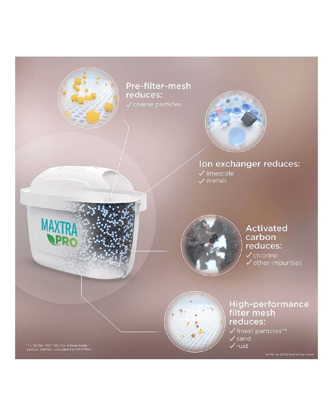 - The natural activated carbon and extra powerful ion-exchanger pearls reduce microparticles even 4x better compared to the previous MAXTRA+ cartridge.