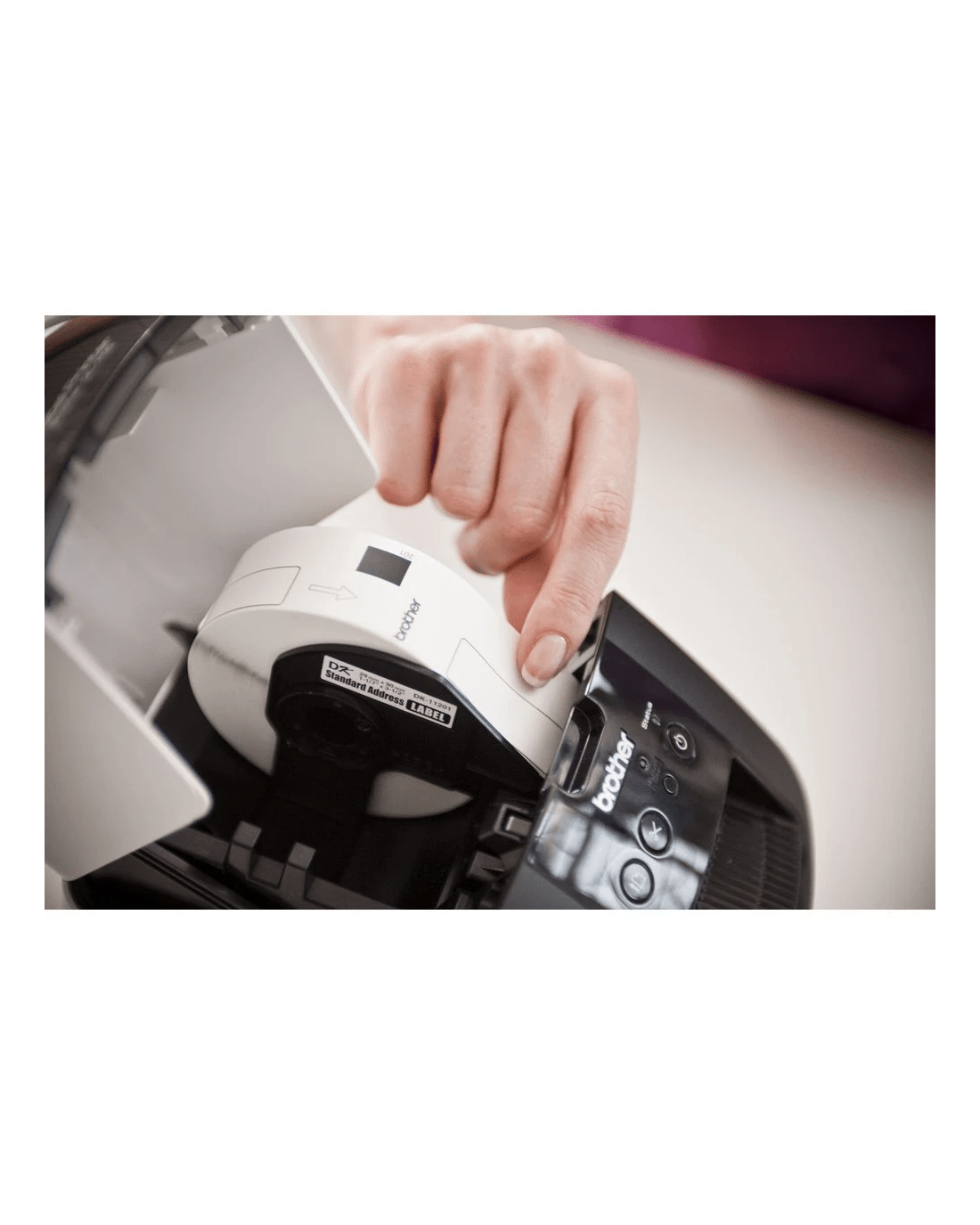 - It utilises Brother DK label rolls with a maximum roll width of 62 mm and a maximum label length of up to 1 m.