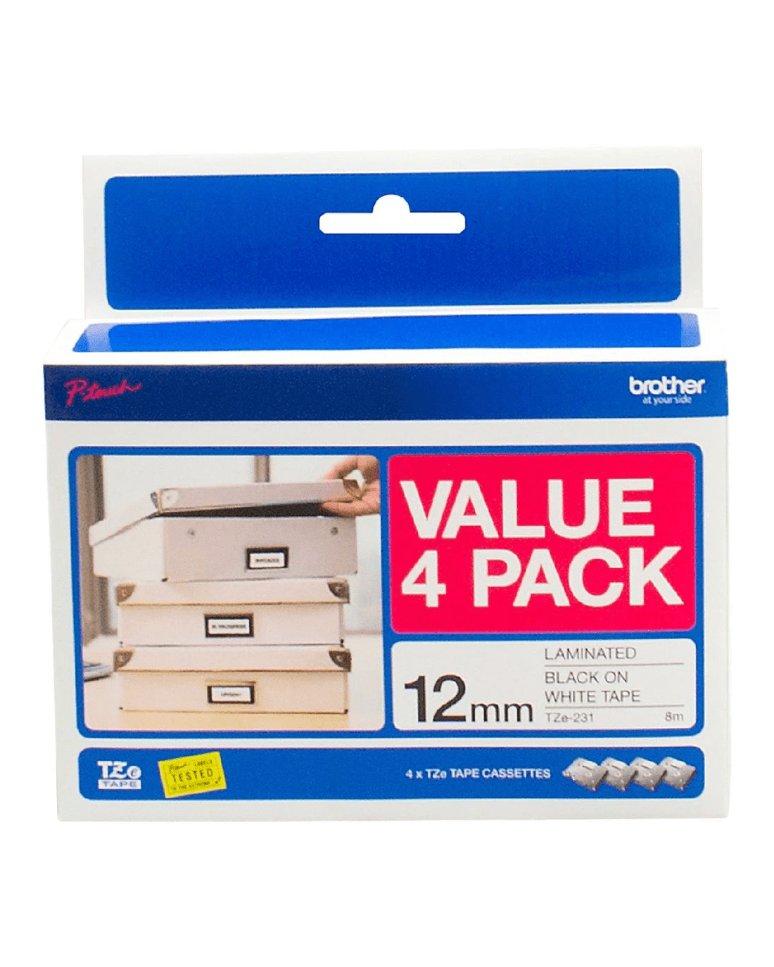 Sold by OfficeworksBrother TZe-231 Laminated Tape 12mm x 8m Black on White 4 Pk