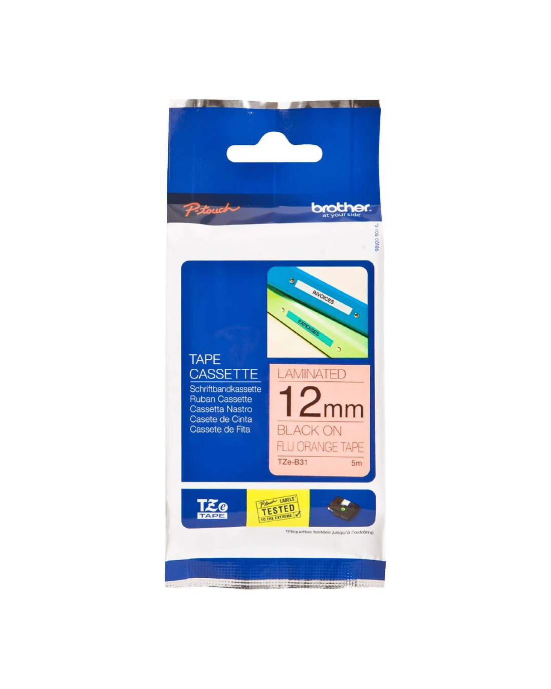 Brother TZe-B31 12 mm x 5 m Black On Fluoro Orange Tape is perfect for restocking your Brother TZe label maker. It is constructed from super-clear polyethylene laminate which is temperature, fade, water and chemical resistant. The strong adhesive backing makes it easy to stick your labels to all your necessary items.