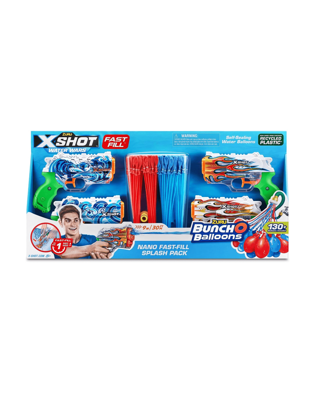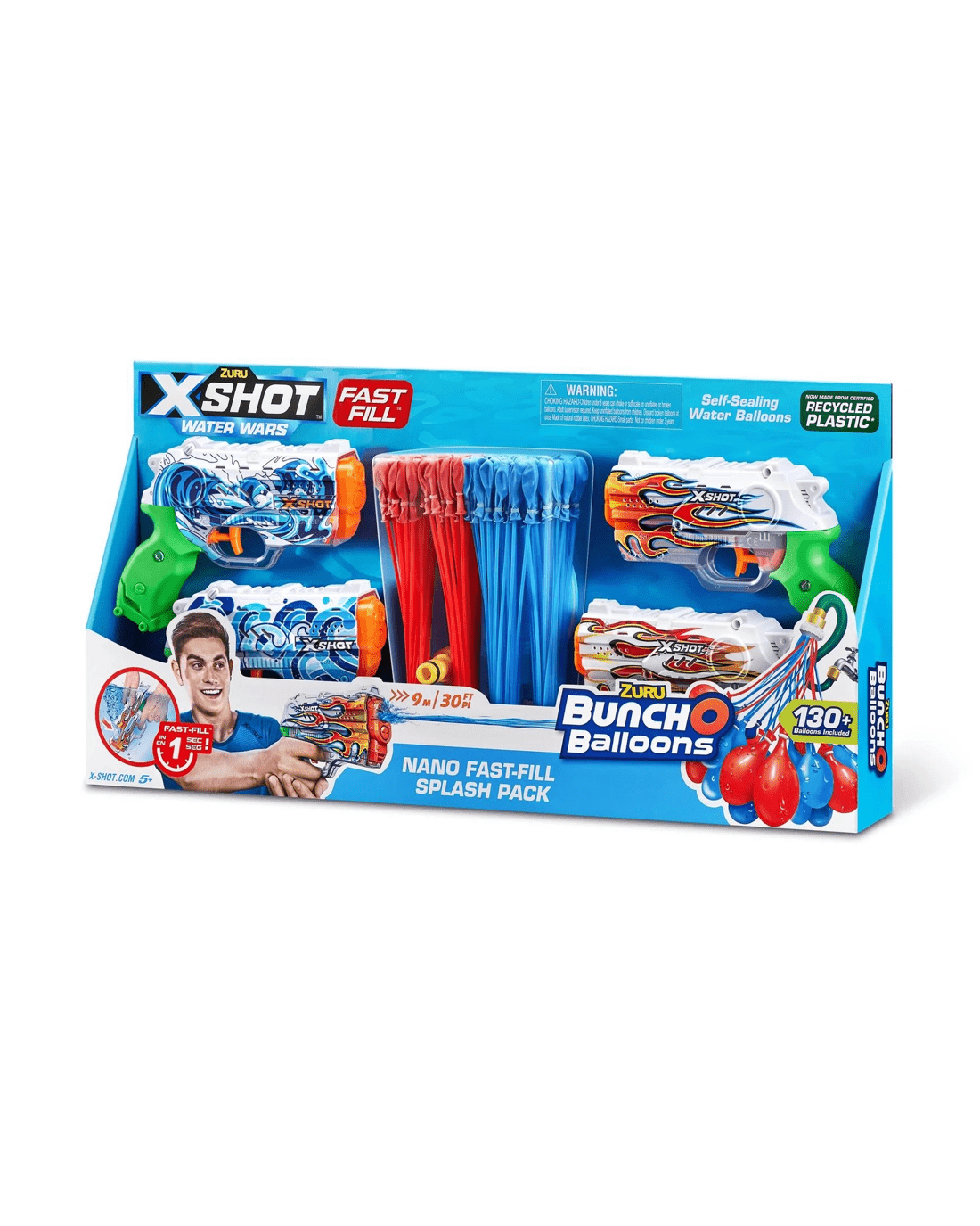 - Pack Includes: 4x X-Shot Water Fast-Fill Skins Nano Water Blasters 4x Bunch O Balloons Stems (130+ Water Balloons)