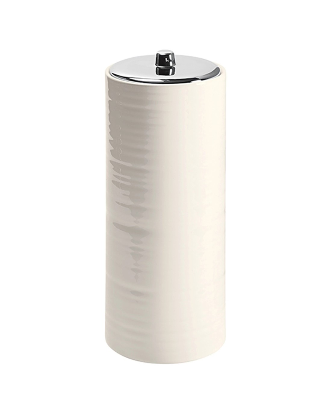 This elegant canister features a chrome handle and a chrome-coated ceramic lid, providing a sophisticated touch while keeping toilet rolls neatly concealed from view. Its simple yet versatile design makes it an ideal addition to enhance your bathroom's organisation and aesthetic.