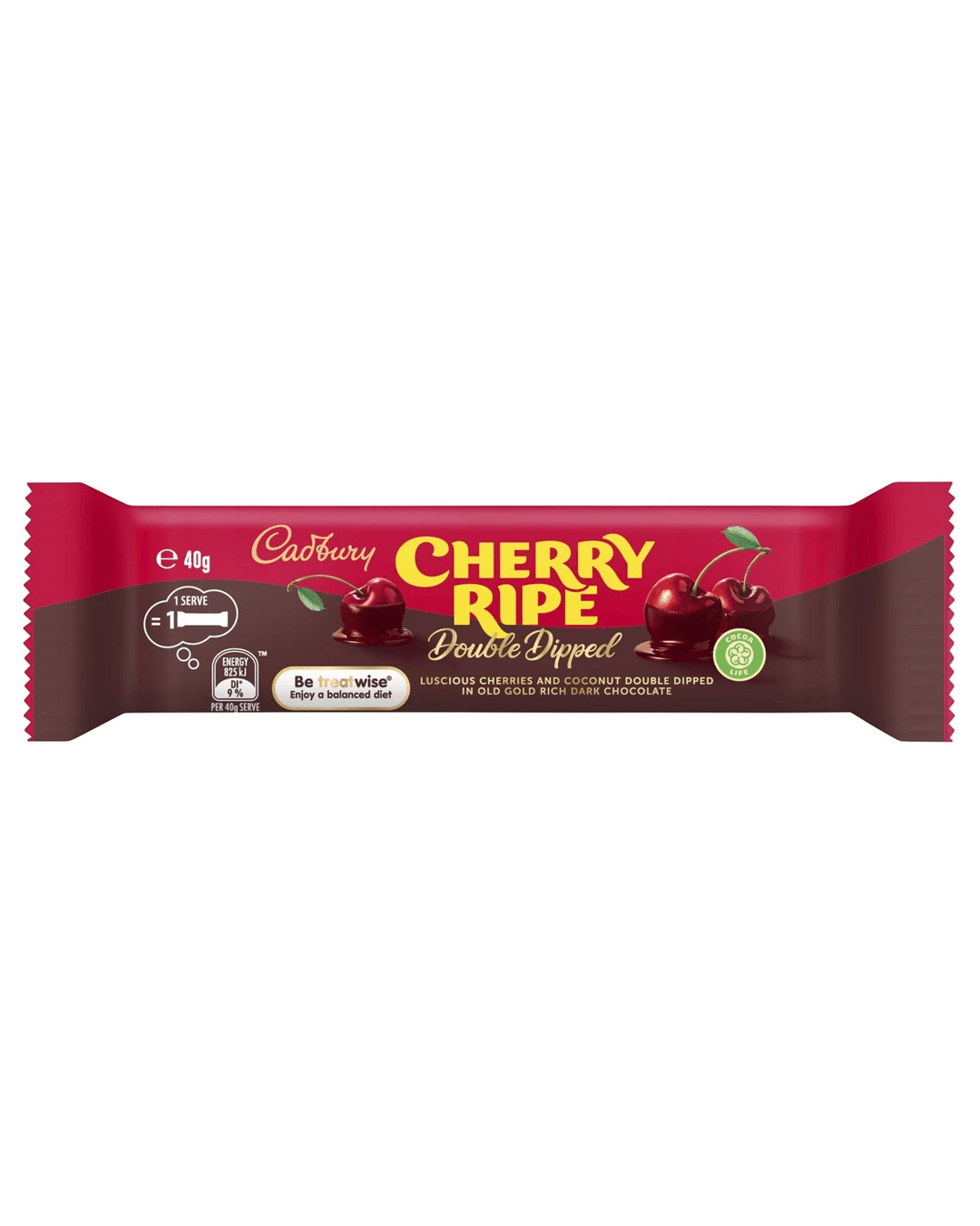 Enjoy the Big Cherry Taste. The ripe juicy cherries and moist coconut smothered in Old Gold rich dark chocolate ensures a unique taste experience. Cherry Ripe offers an indulgent and rich treat.
