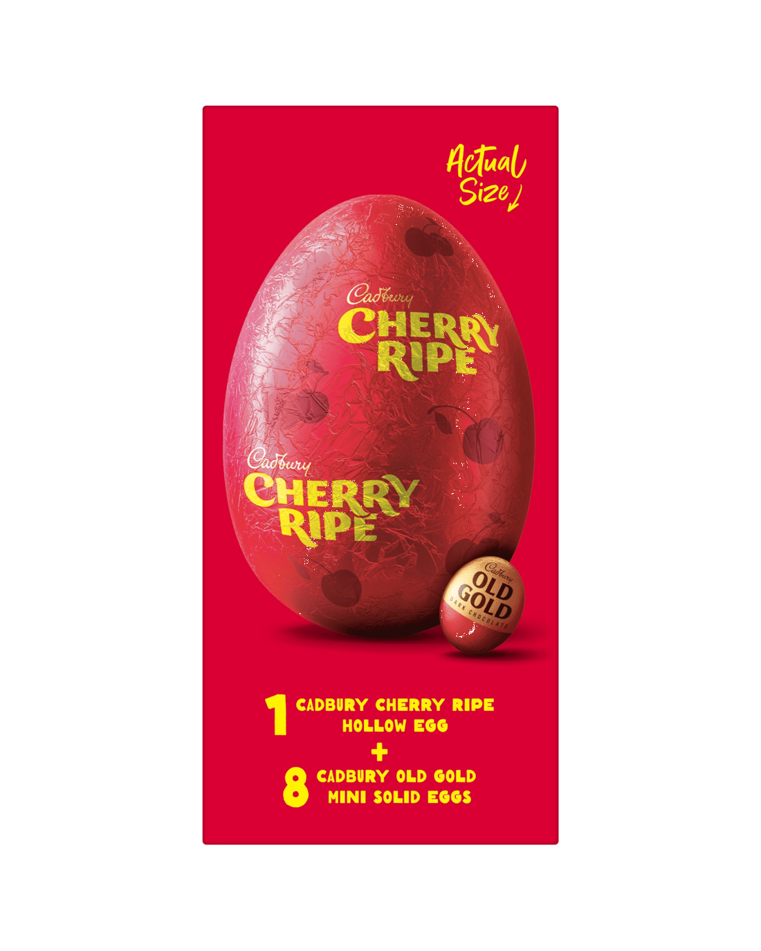 Cointaining a deliciously rich dark chocolate hollow easter egg with Cherry Ripe pieces and mini Cadbury Old Gold eggs presented in an Easter themed gift box perfect for any dark chocolate lover.