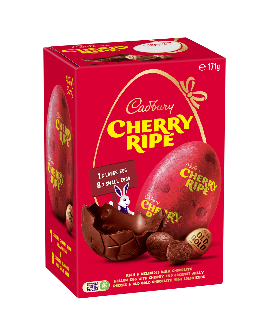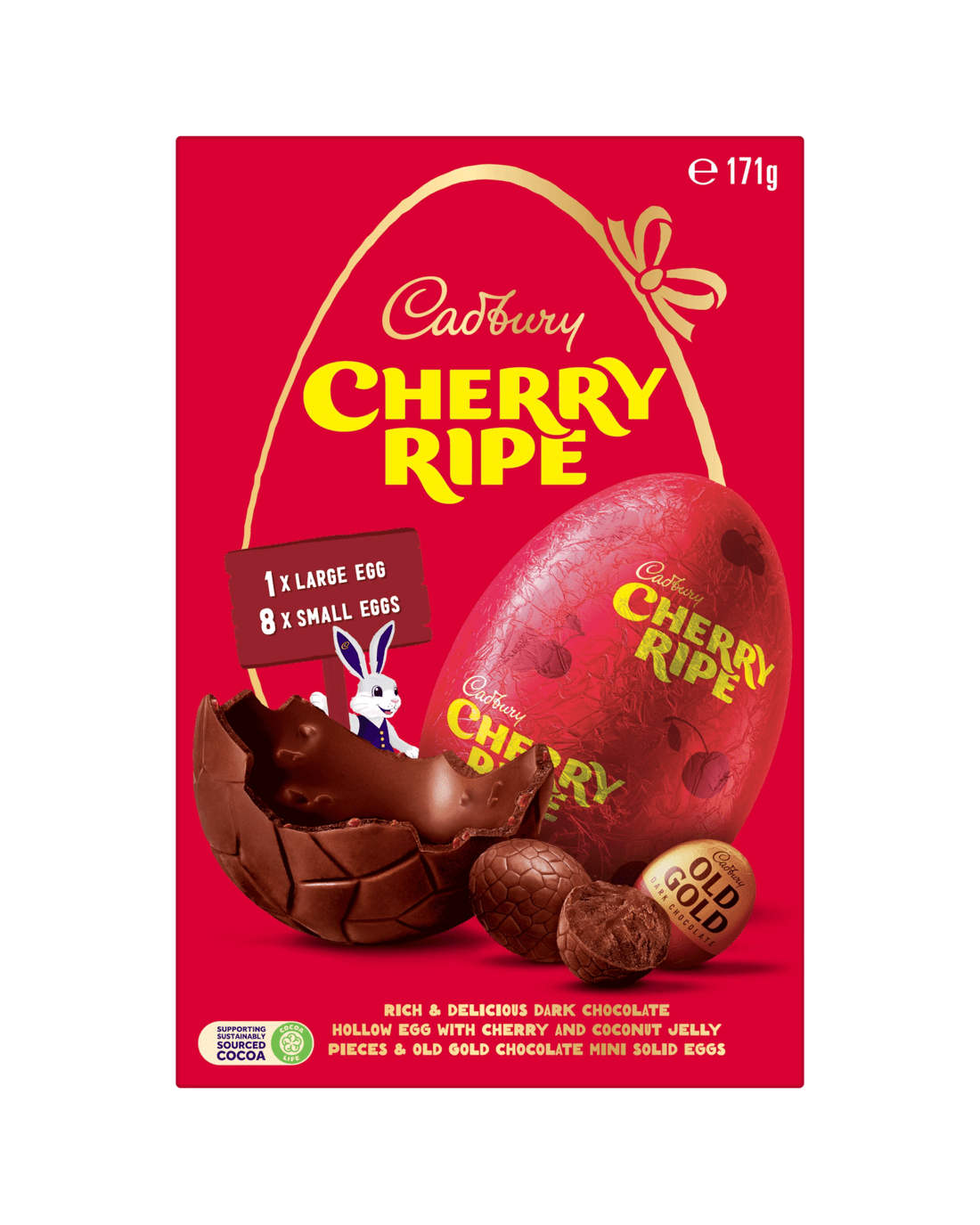 - Rich and delicious dark chocolate hollow egg with cherry ripe pieces and old gold