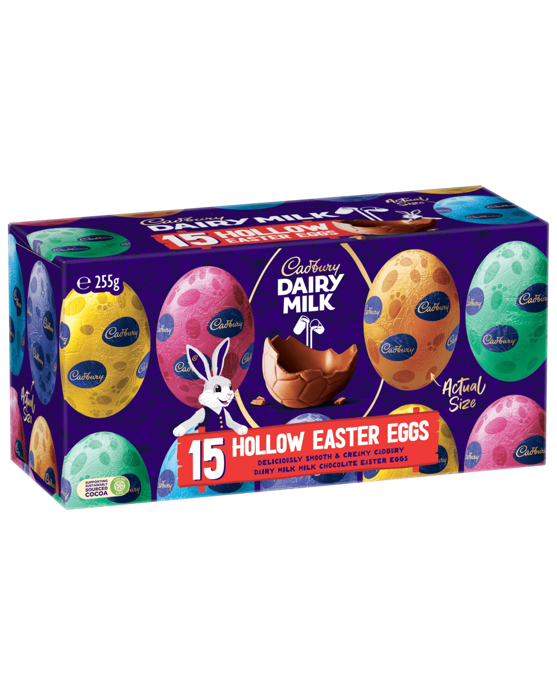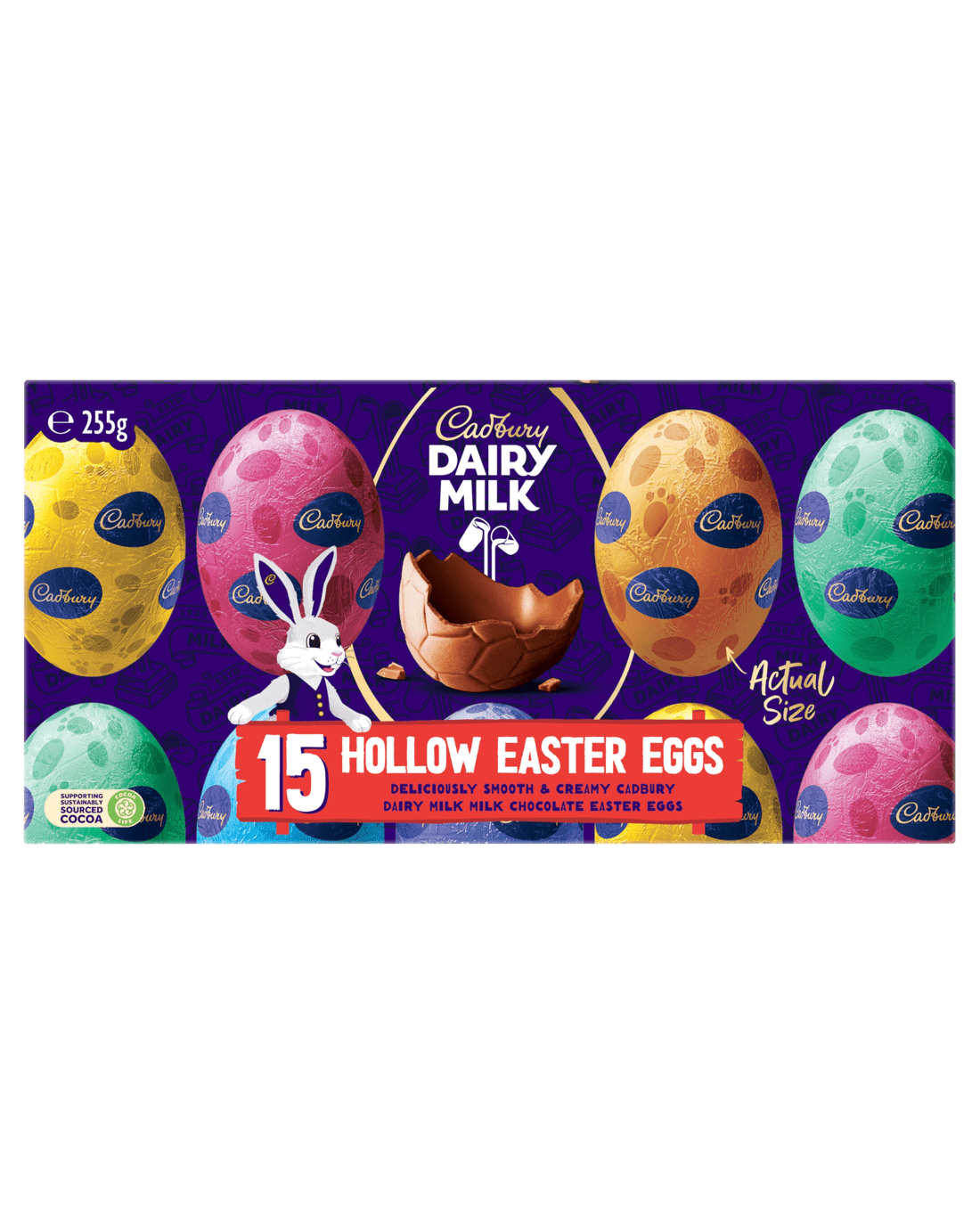 Includes 15 CADBURY DAIRY MILK milk chocolate hollow easter eggs.
