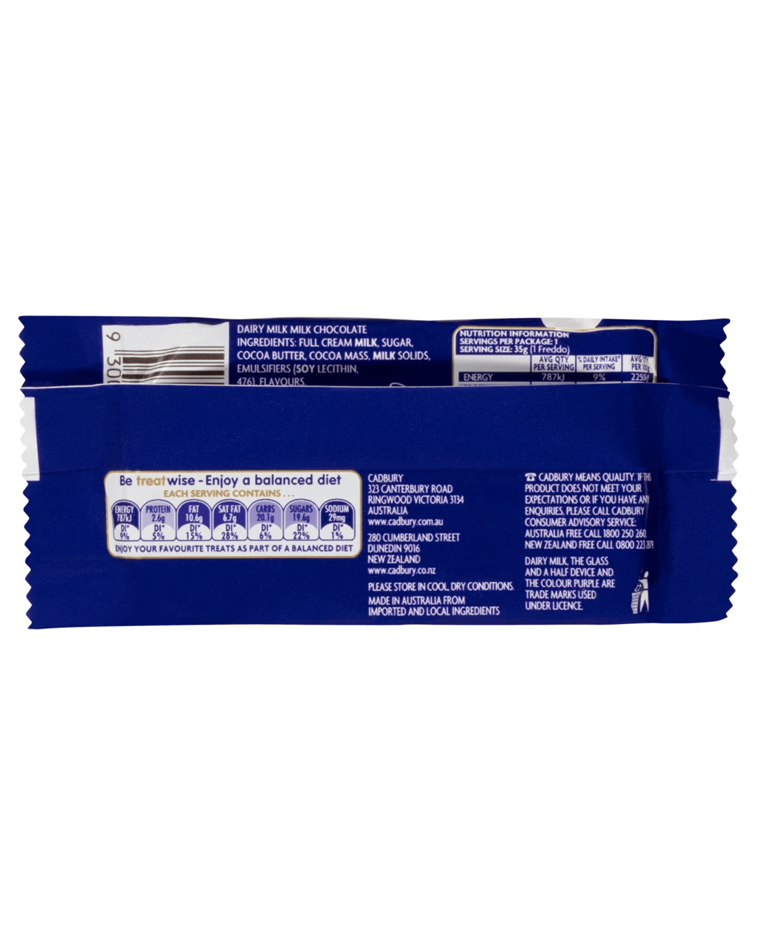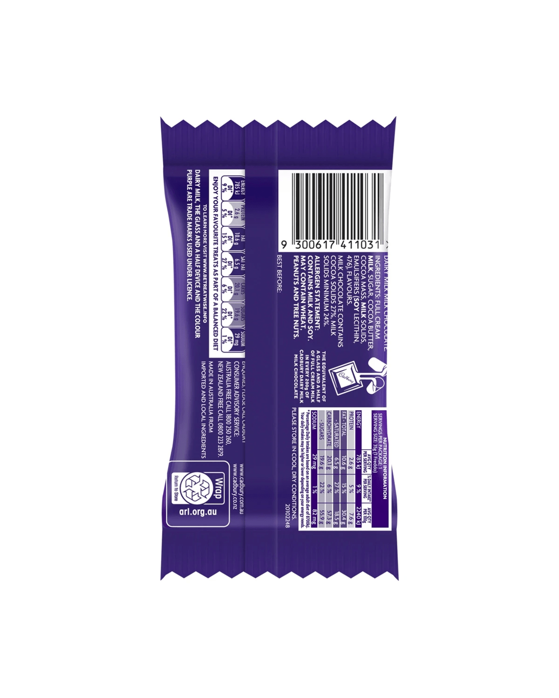 • Ingredients: Full Cream Milk, Sugar, Cocoa Butter, Cocoa Mass, Milk Solids, Emulsifiers (Soy Lecithin, 476), Flavours