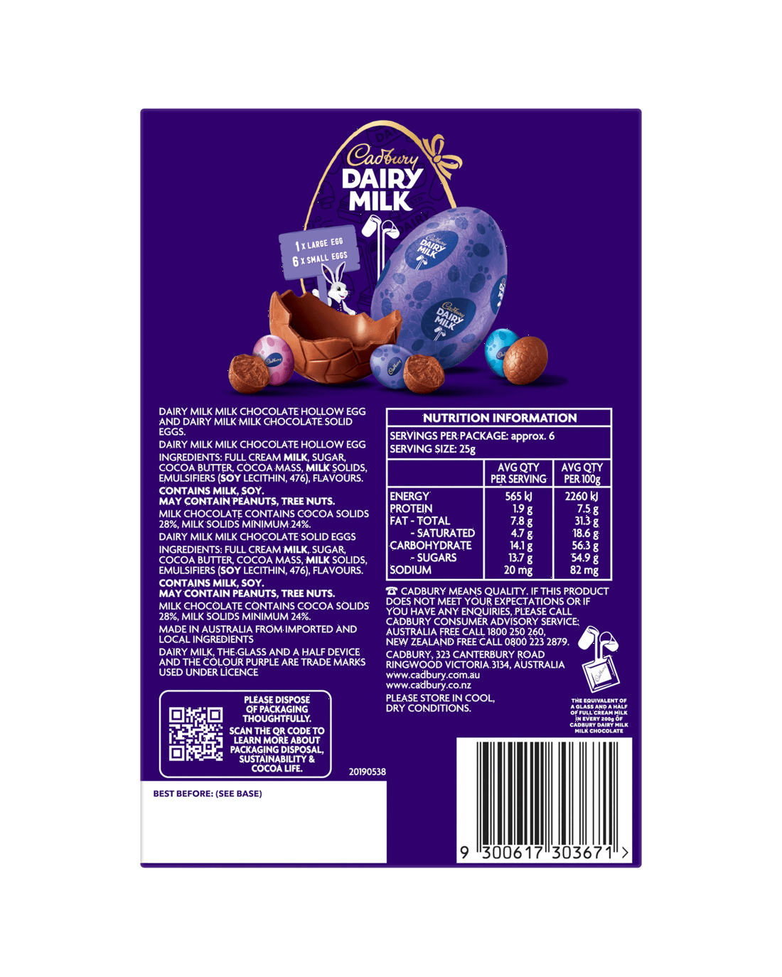 - Dairy Milk milk chocolate solid eggs: Full Cream Milk, Sugar, Cocoa Butter, Cocoa Mass, Milk Solids, Emulsifiers (Soy Lecithin, 476), Flavours