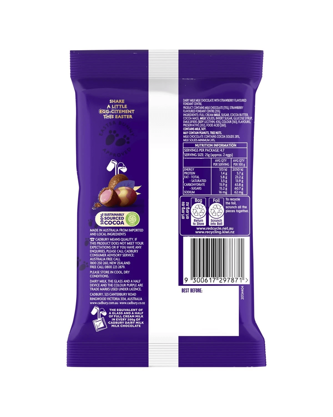 - Ingredients: Full Cream Milk, Sugar, Cocoa Butter, Cocoa Mass, Milk Solids, Invert Sugar, Glucose Syrup, Emulsifiers (Soy Lecithin, 476), Colour (163), Flavours, Preservative (202), Food Acid (260)