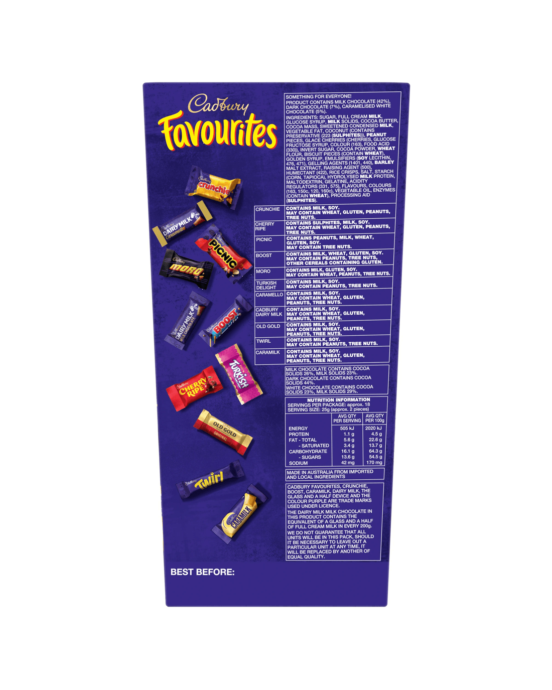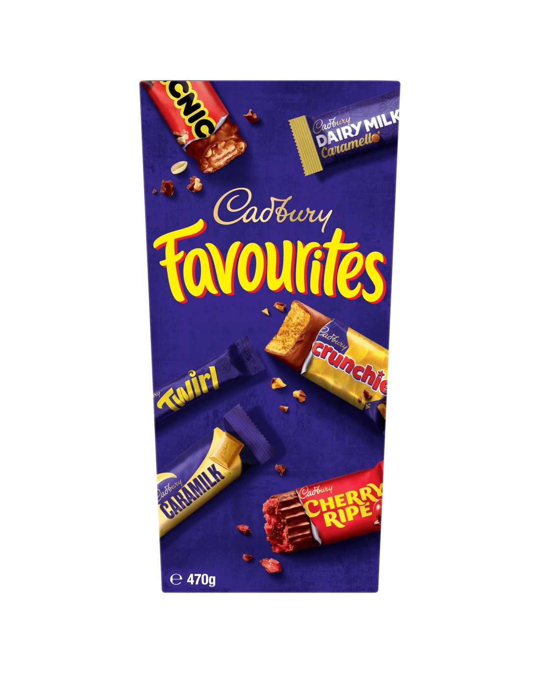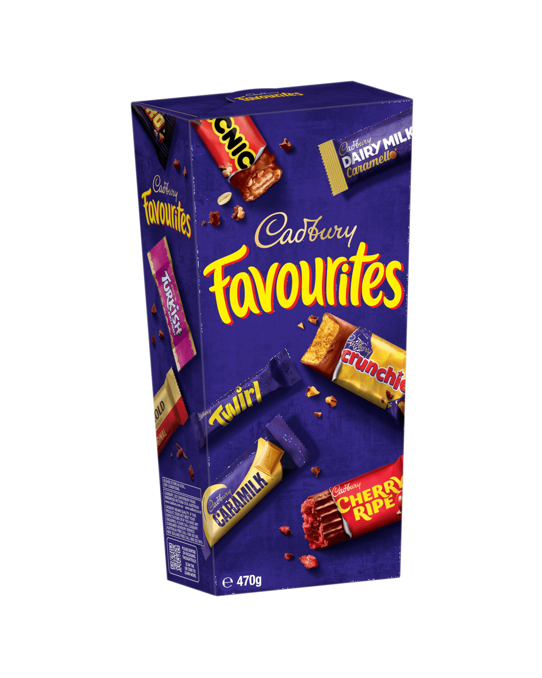 Cadbury Favourites Boxed Chocolate includes an assortment of Cadbury Caramilk, Cadbury Crunchie, Cadbury Twirl, Cadbury Moro, Cadbury Boost, Cadbury Dairy Milk, Fry's Turkish Delight, Cadbury Cherry Ripe, Cadbury Old Gold, Cadbury Picnic & Cadbury Dairy Milk Caramello chocolate pieces.