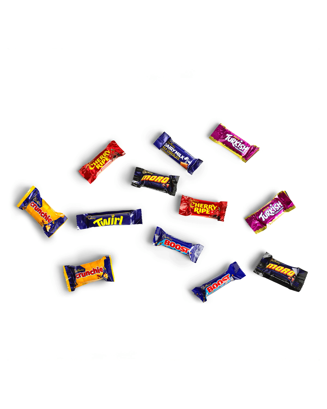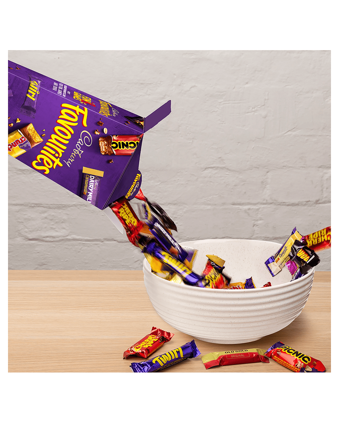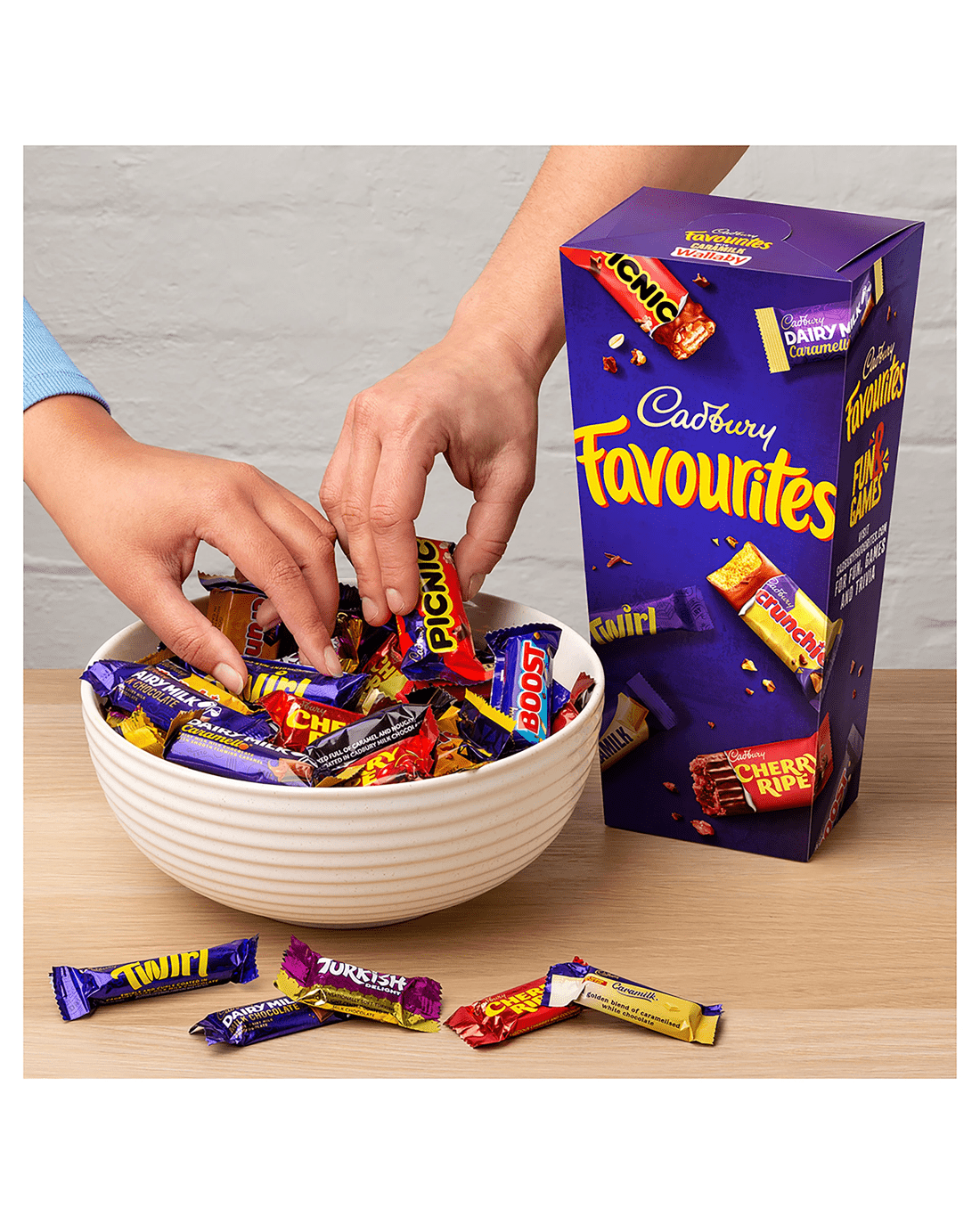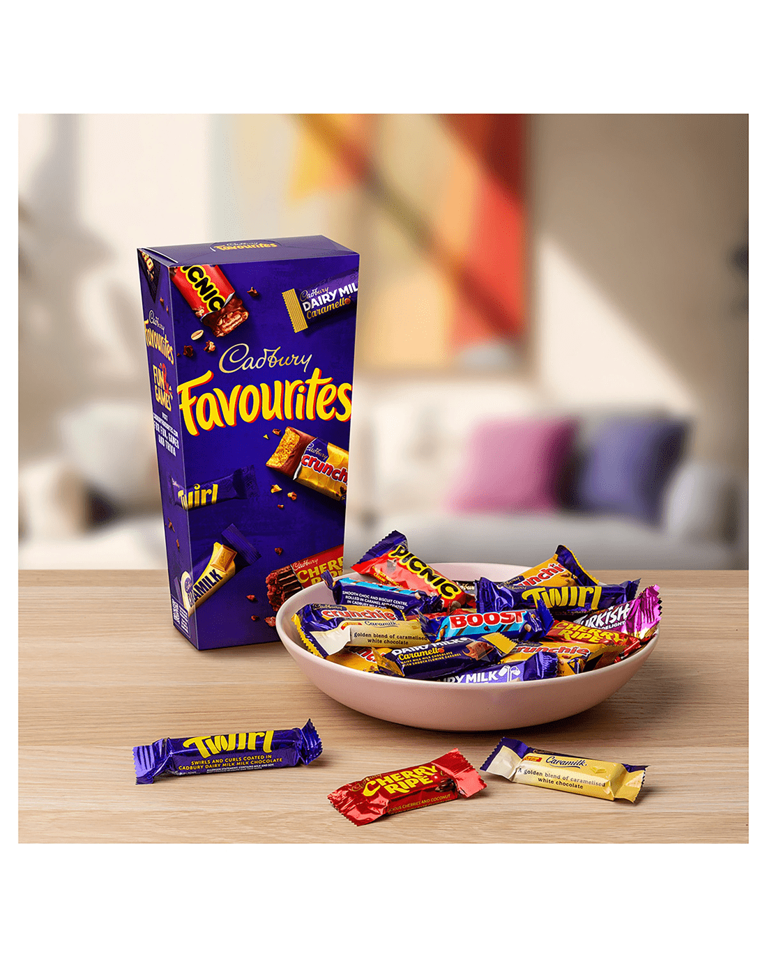 Cadbury Favourites Boxed Chocolate includes an assortment of Cadbury Caramilk, Cadbury Crunchie, Cadbury Twirl, Cadbury Moro, Cadbury Boost, Cadbury Dairy Milk, Fry's Turkish Delight, Cadbury Cherry Ripe, Cadbury Old Gold, Cadbury Picnic & Cadbury Dairy Milk Caramello chocolate pieces.
