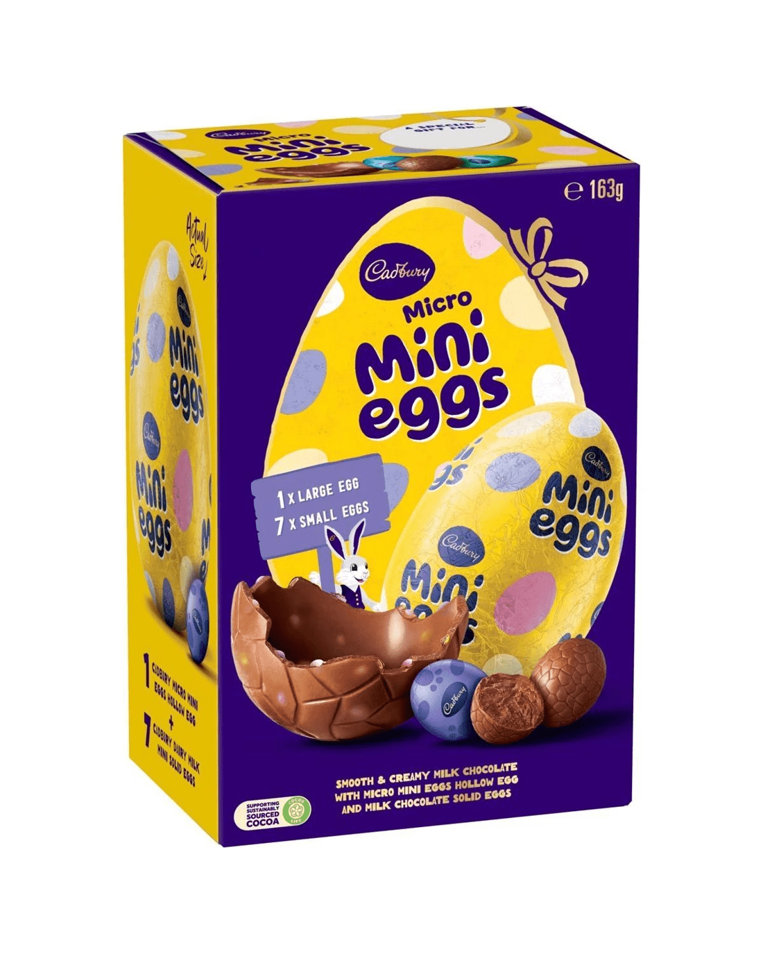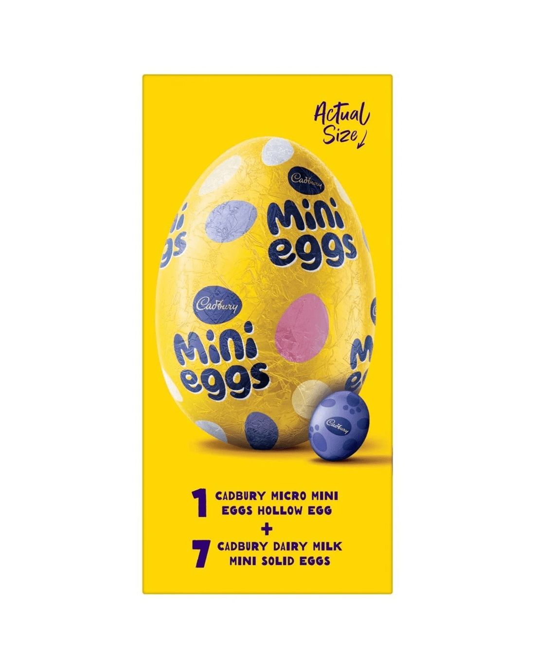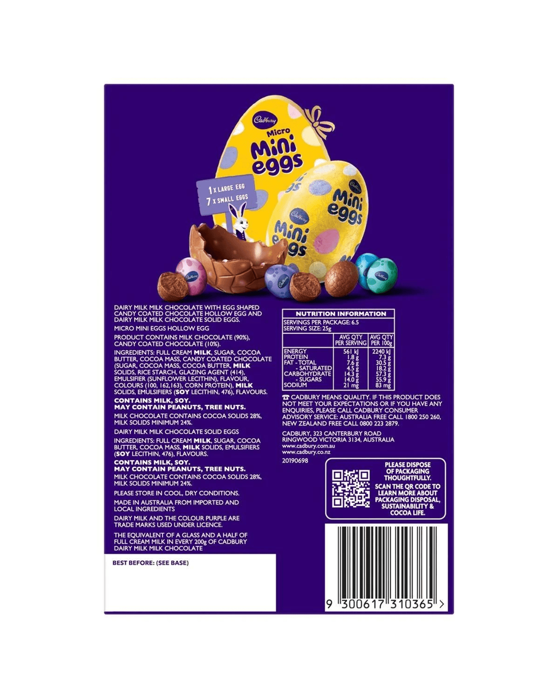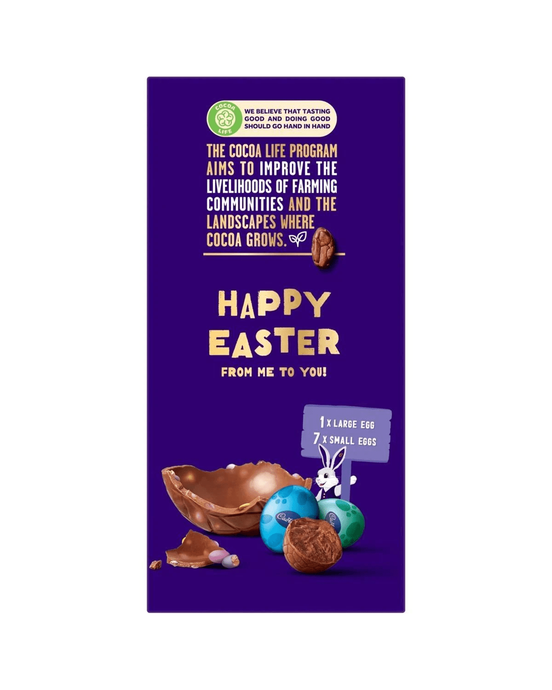- Includes 1 x 110g Cadbury Dairy Milk milk chocolate hollow egg containing micro mini eggs and 7 x small Cadbury Dairy Milk milk chocolate solid eggs