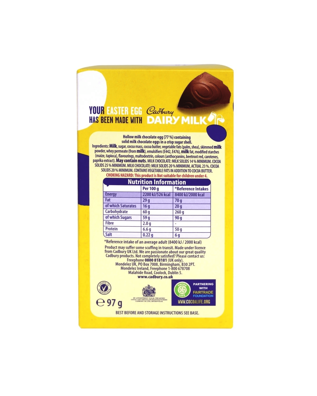 - Hollow milk chocolate egg (77%) containing solid milk chocolate eggs in a crisp sugar shell