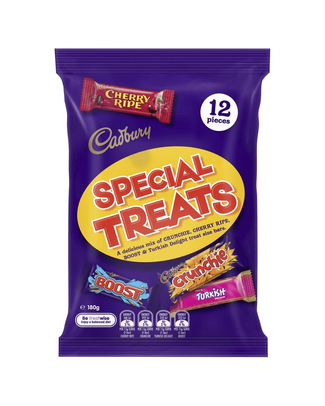 12 Special Treats perfect for sharing or snacking! Featuring a delicious variety of Crunchie, Cherry Ripe, Boost and Turkish Delight chocolate bars.