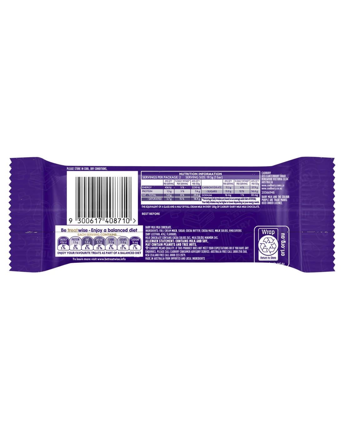 - Ingredients: Full Cream Milk, Sugar, Cocoa Butter, Cocoa Mass, Milk Solids, Emulsifiers (Soy Lecithin, 476), Flavours