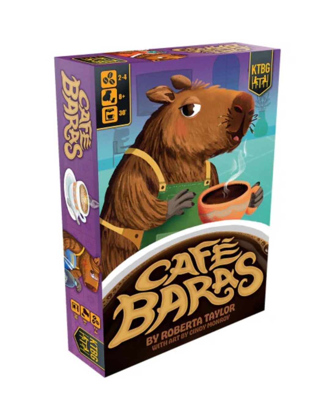 Everyone in town is looking for a cozy little café where they can relax with a good book, something to nibble on, and, of course, some delicious caffeinated beverages. As a capybara with a love for coffee, it's always been a dream of yours to open your own shop. Now is the perfect time! But you're not the only one opening your doors in hopes of enticing customers. Rival coffee shops are popping up all over town and it's up to you to ensure that you have the right food, drinks, and decor to turn your drop-ins into regulars. Put together a delicious menu and decorate your shop to capture the perfect aesthetic. You just might have the busiest little café in town! Each turn, you play a card from your hand, either buying it as a food, drink, or decor item for your café or serving the customer on the card and earning money. If you meet a customer's needs completely, they become a Regular and earn you extra end game points! Café Baras is a card drafting, tableau-building game brought to you by the creative team behind the critter classics Creature Comforts and Maple Valley. Designed by Roberta Taylor and featuring illustrations by Cindy Monroy. Ages: 8+ | Players: 2 - 4 | Playtime: 30 mins