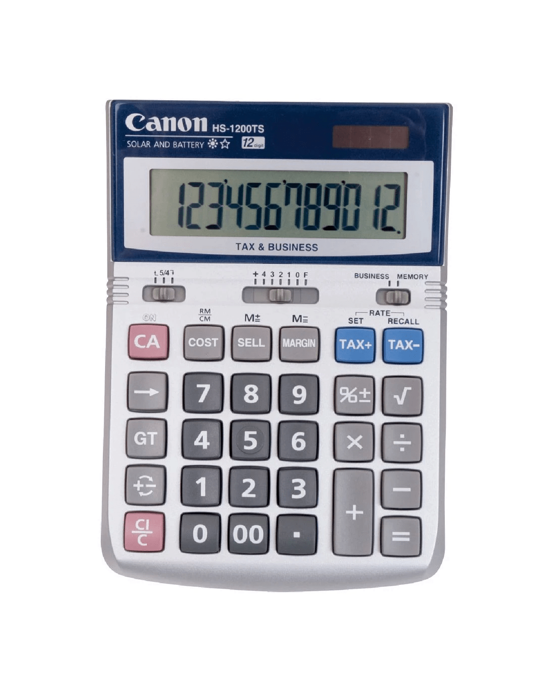 This Canon HS-1200TS 12 Digit Desktop Calculator is perfect for use at home or in the office. The high quality keys provide accuracy and precision with the keyboard touch button style. It features tax calculation capabilities so you can add or subtract a predetermined tax rate and business functions to help you calculate costs and margins.